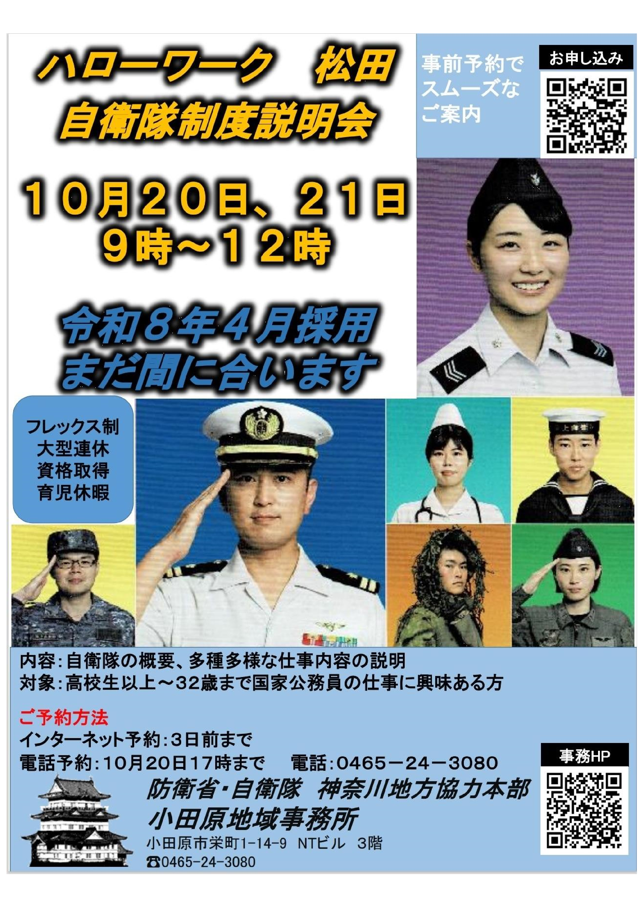 ●9月26日 10月20日(月)、21日(火)開催「自衛隊制度説明会」の参加者の募集を開始しました。