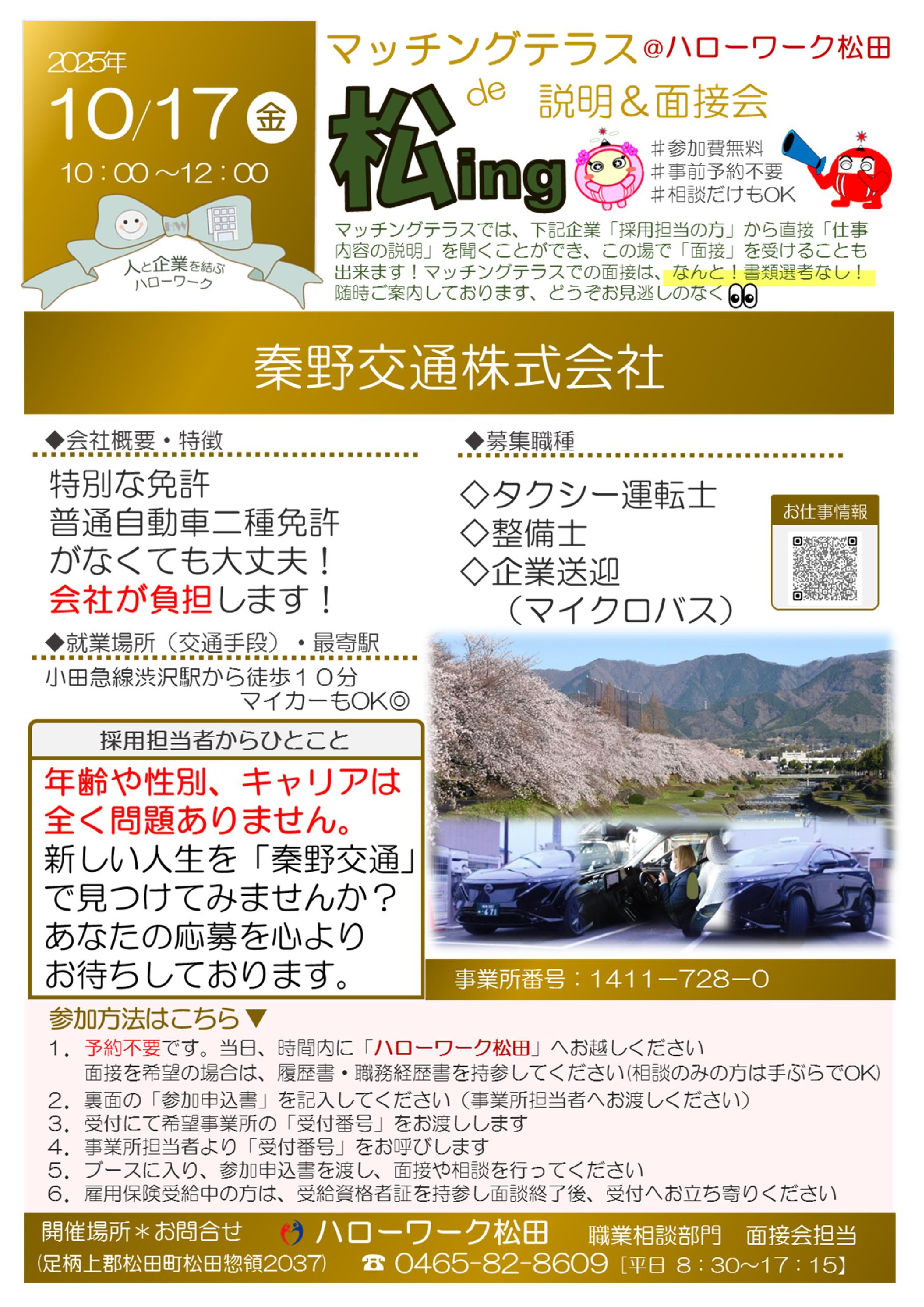 ●10月7日 10月17日(金)開催「秦野交通株式会社 説明&面接会」の参加者の募集を開始しました。