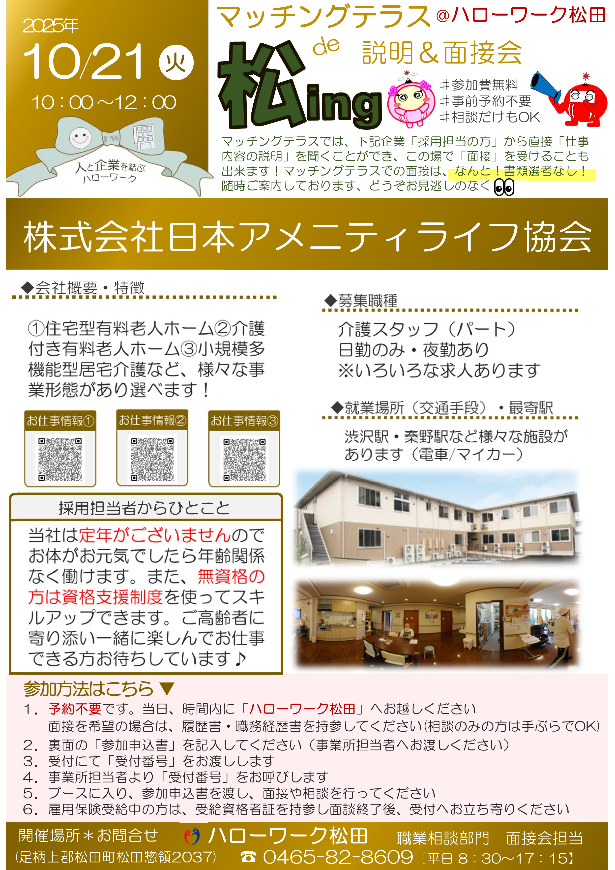 ●10月7日 10月21日(火)開催「株式会社日本アメニティライフ協会 説明&面接会」の参加者の募集を開始しました。