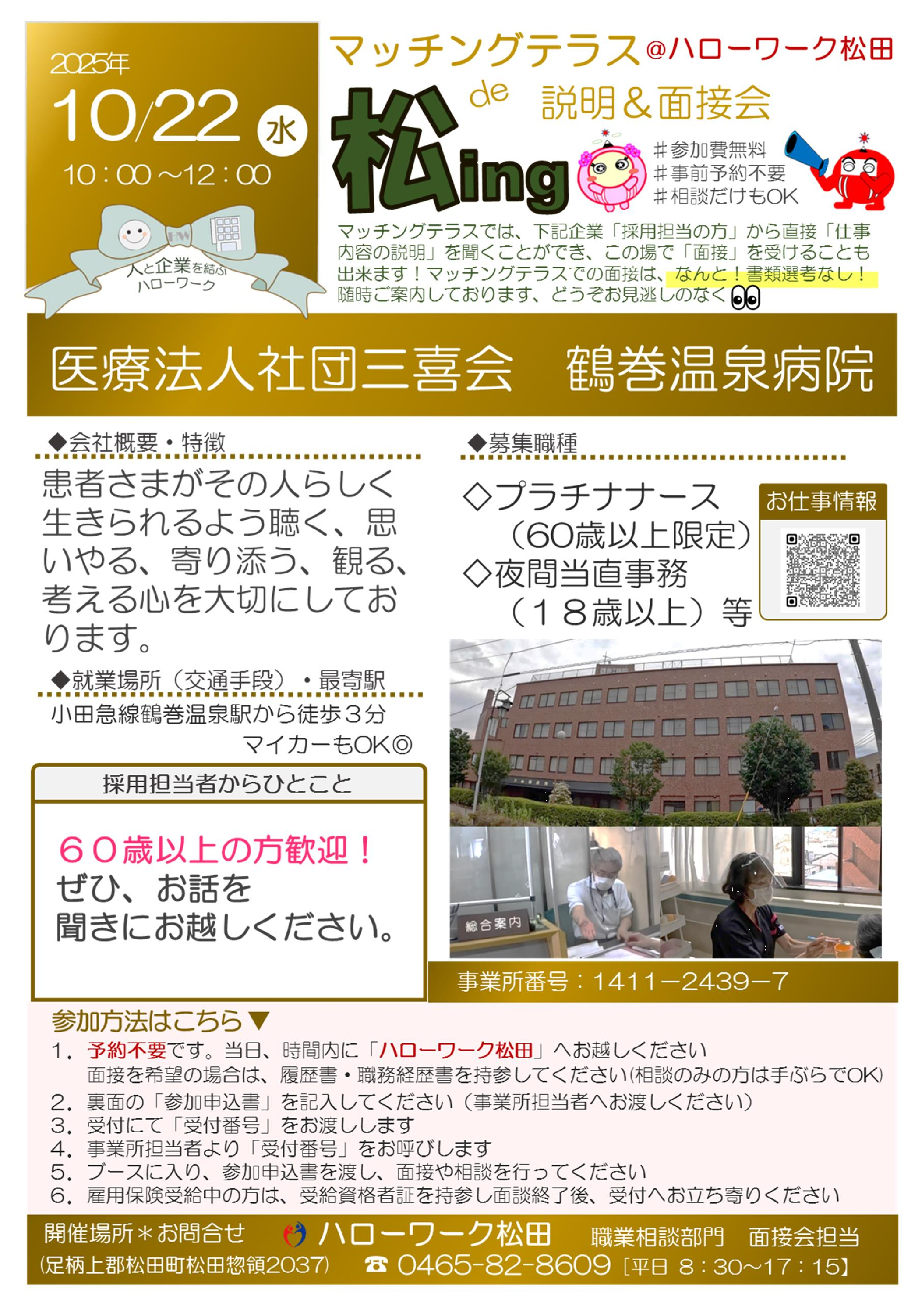 ●10月7日 10月22日(水)開催「医療法人社団三喜会鶴巻温泉病院 説明&面接会」の参加者の募集を開始しました。
