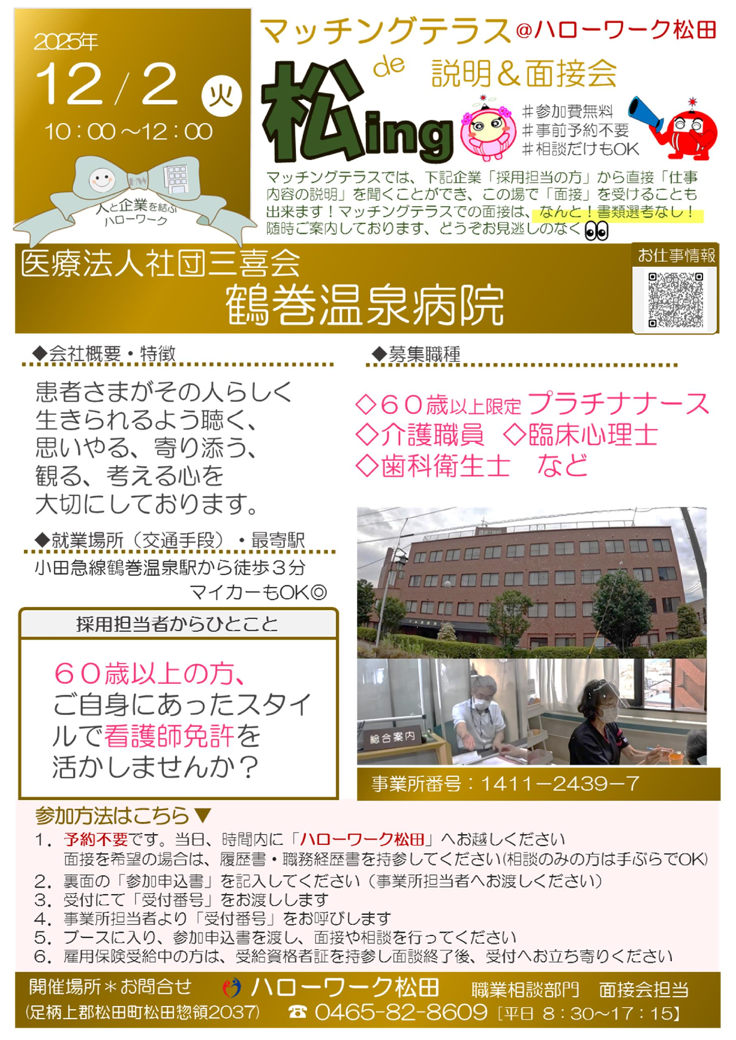 ●11月13日 12月2日(火)開催「医療法人社団三喜会鶴巻温泉病院 説明&面接会」の参加者の募集を開始しました。