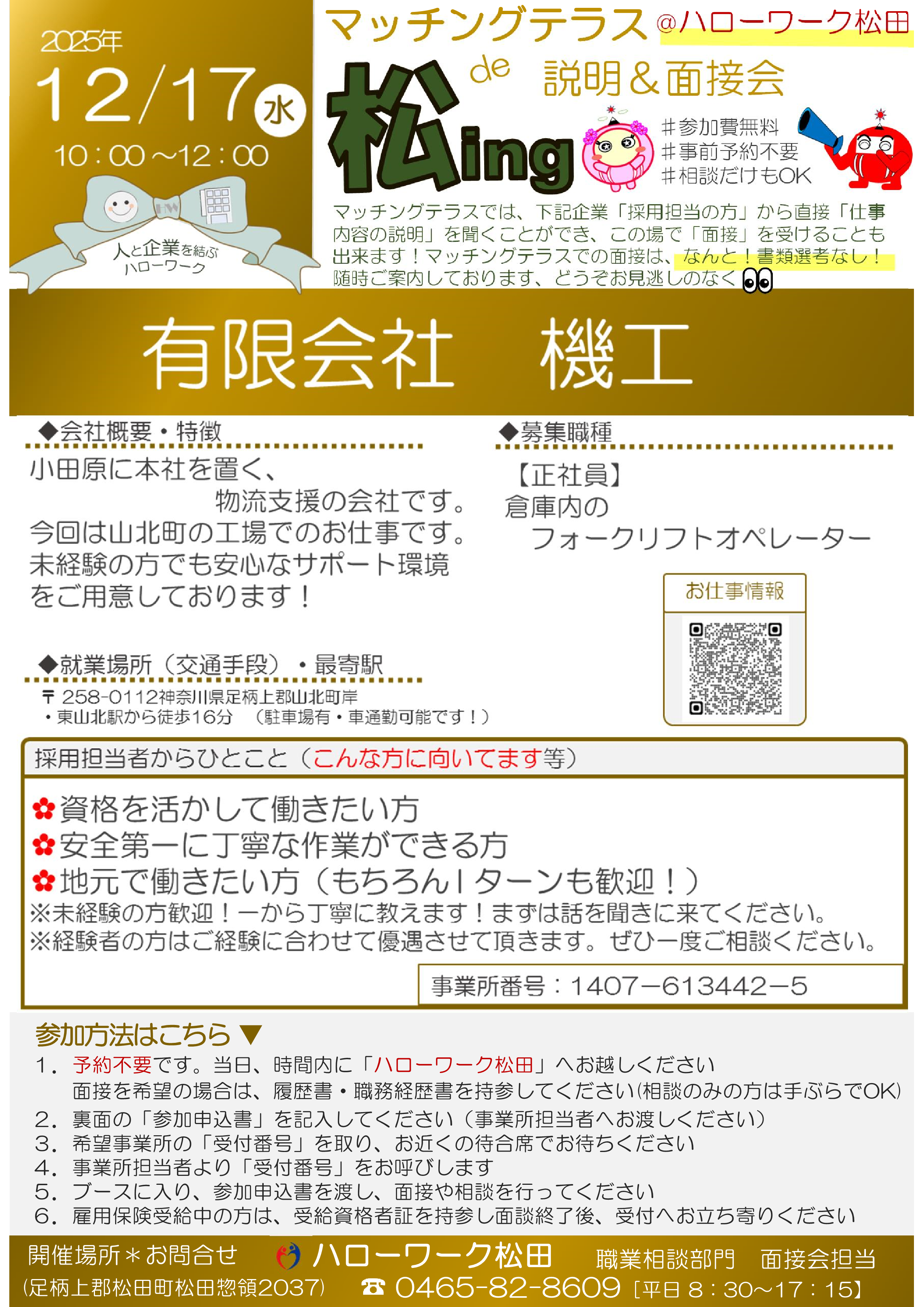 ●11月21日 12月17日(水)開催「有限会社機工 説明&面接会」の参加者の募集を開始しました。