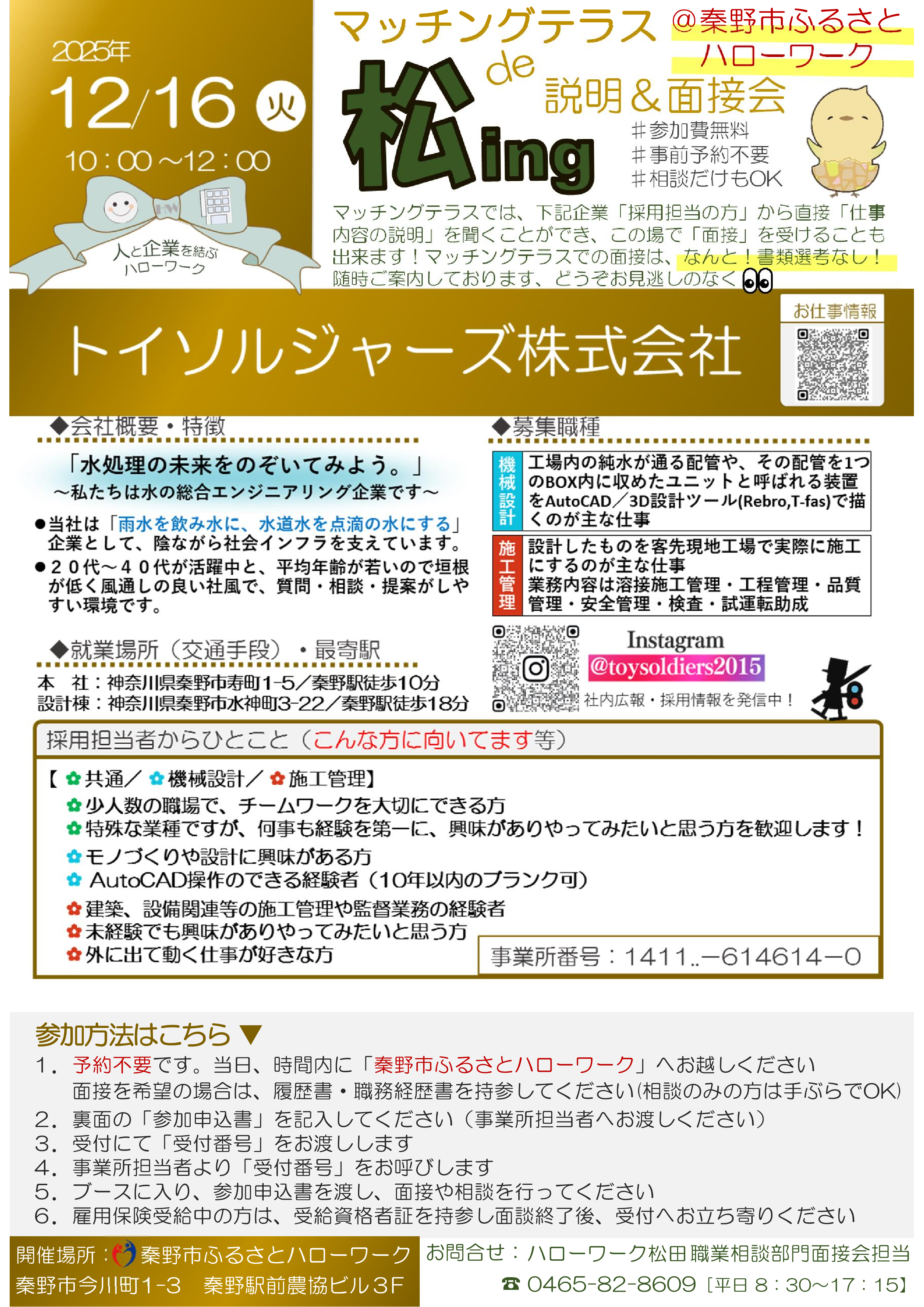 ●11月21日 12月16日(火)開催「トイソルジャーズ株式会社 説明&面接会」の参加者の募集を開始しました。