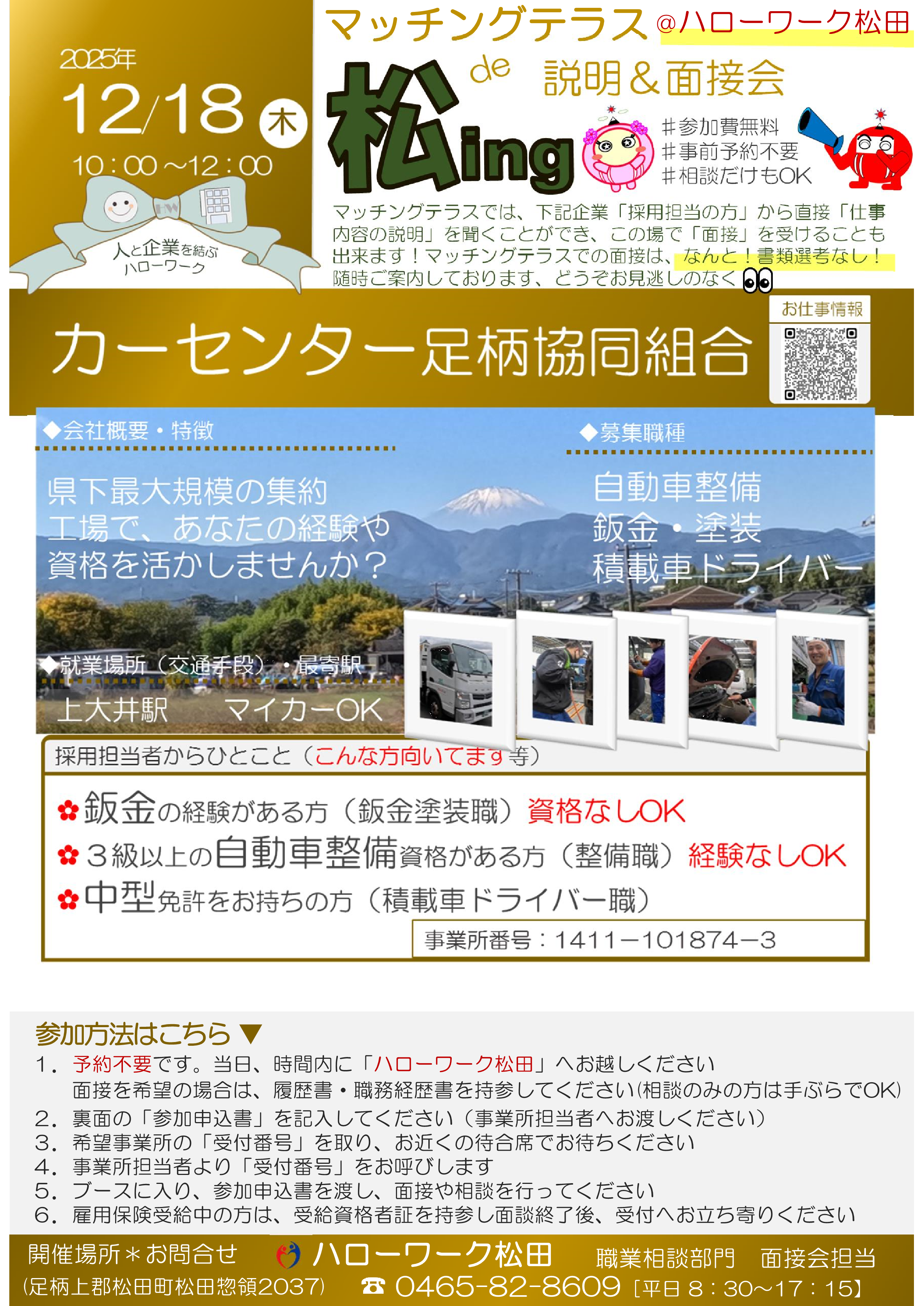 ●11月21日 12月18日(木)開催「カーセンター足柄協同組合 説明&面接会」の参加者の募集を開始しました。