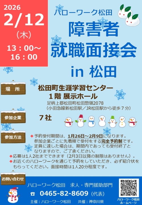 ハローワーク松田の管轄内(秦野市、南足柄市、足柄上郡)が主な就業場所となっている有効中の障害者専用求人がすぐに検索できます