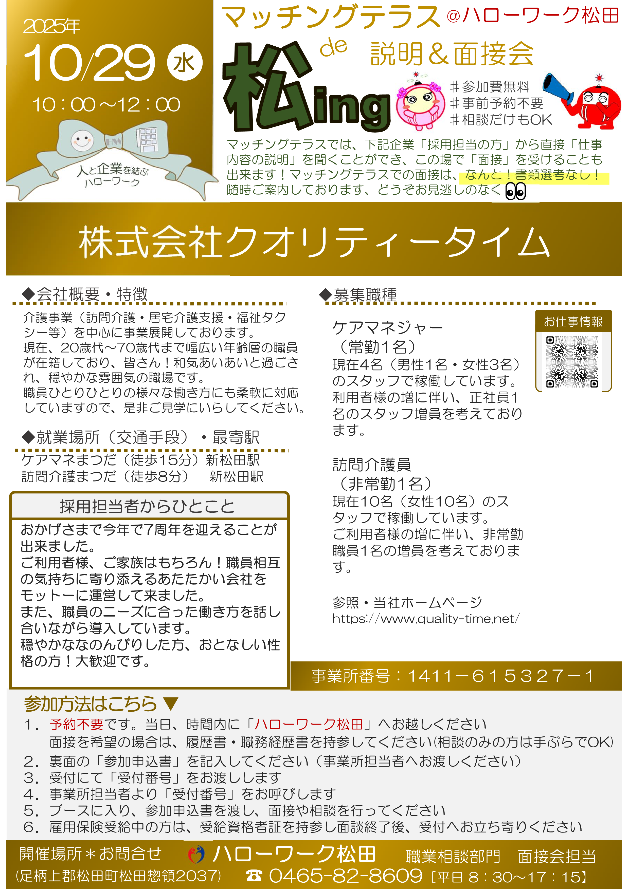 【株式会社クオリティータイム 説明&面接会】を開催します!