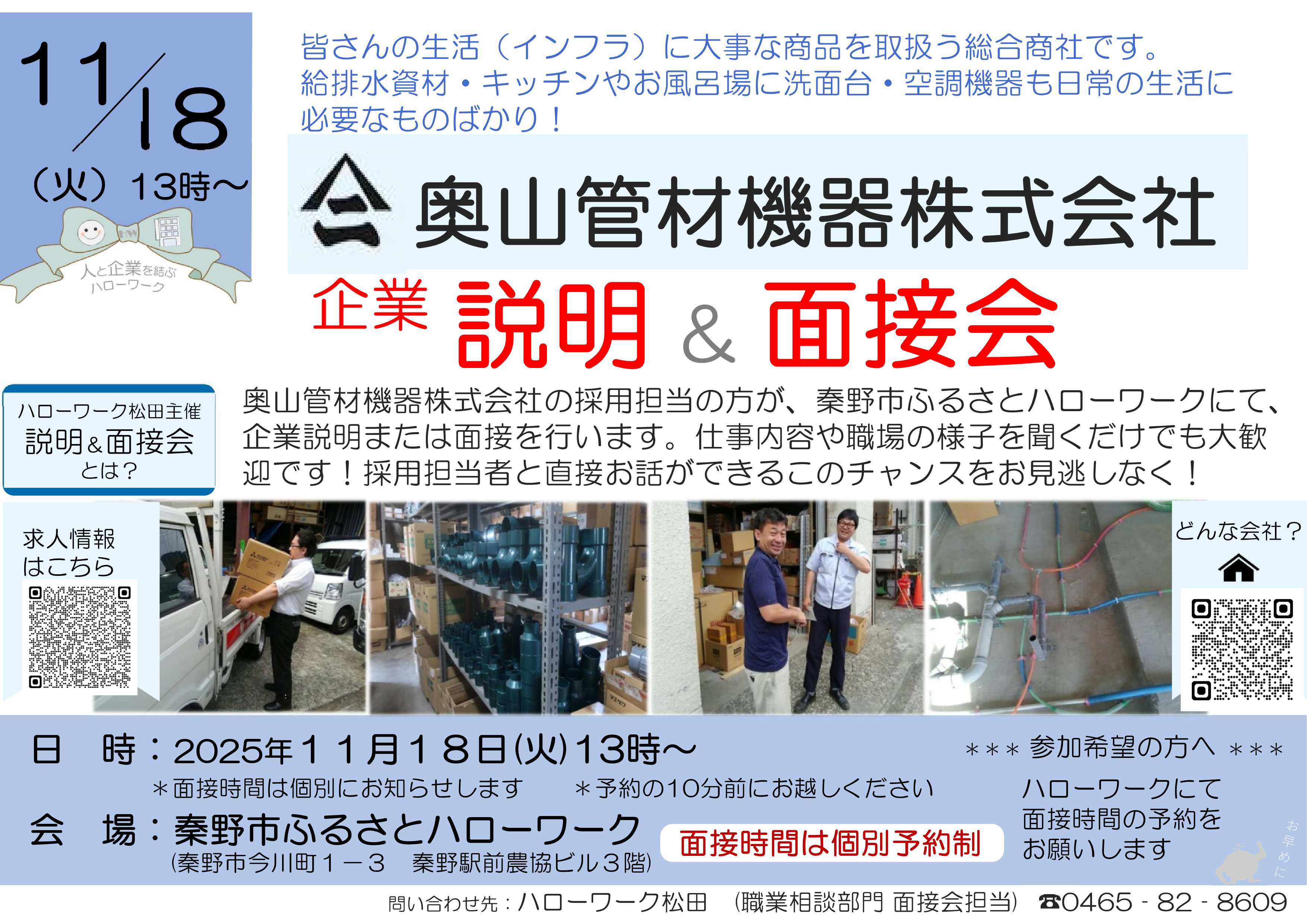 【奥山管材機器株式会社 企業説明&面接会】を開催します!
