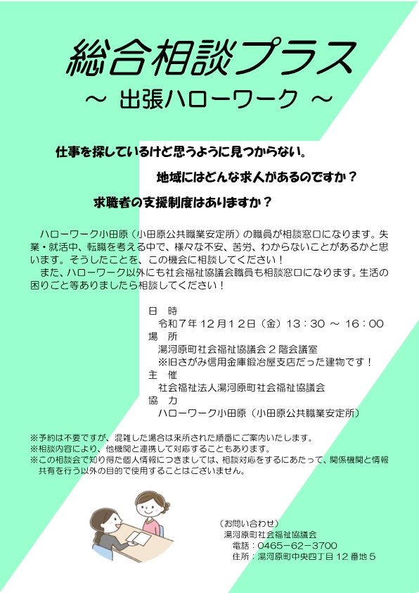 ハローワーク小田原の職業相談の担当相談員が湯河原町社会福祉協議会でお待ちしております。お仕事探しに関するご相談がありましたらご利用ください!
