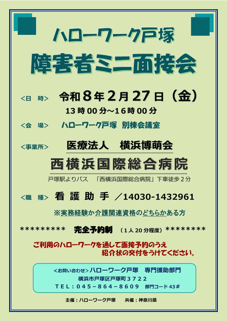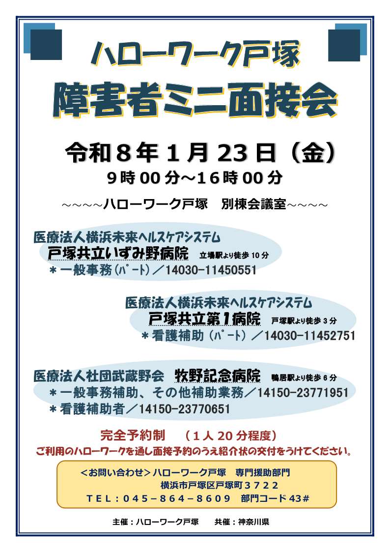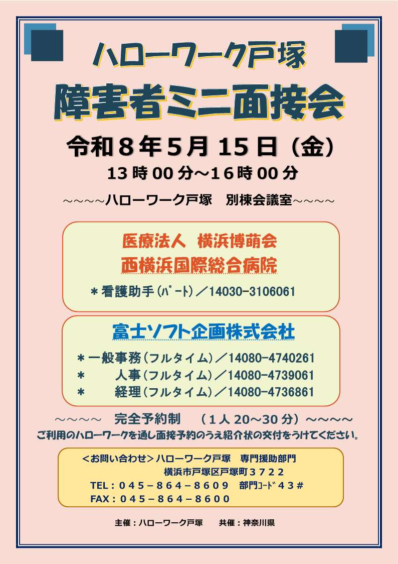 障害のある方専用のハローワーク戸塚管内(戸塚区、瀬谷区、栄区、泉区)の就業場所で有効中の求人を検索します。