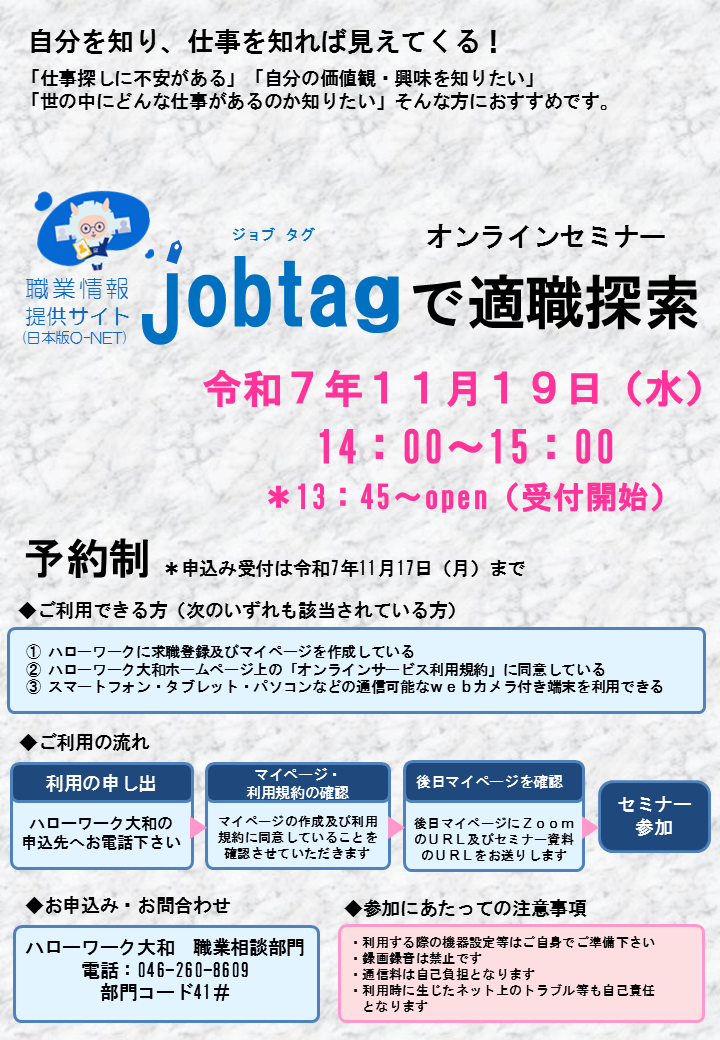 ●11/19 jobtag(ジョブタグ)で適職探索 オンラインセミナーのご案内