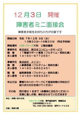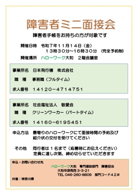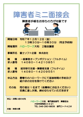 2階会議室にて「障害者ミニ面接会」を開催いたします。