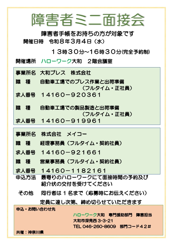 神奈川県内の面接会の情報は神奈川労働局HPをご確認下さい。