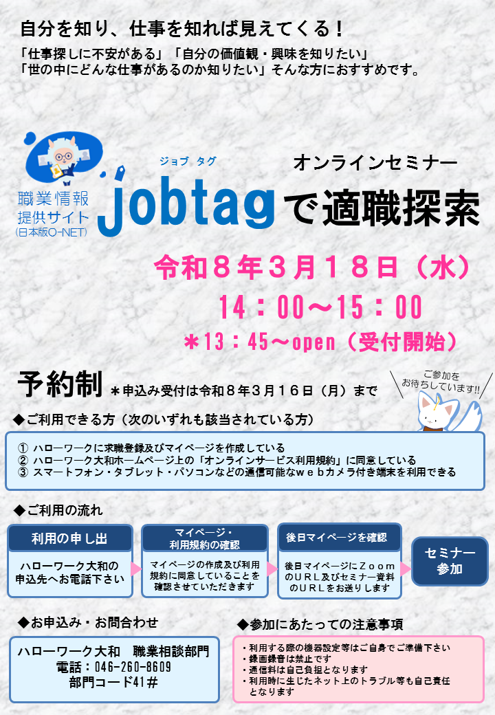 *ハローワーク大和受付またはお電話(046-260-8609 部門コード41# 職業相談部門)にてお申し込みください