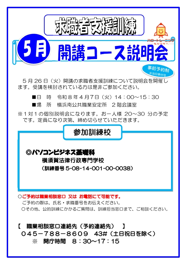 事前予約制(先着順7名、1人20分)となっております。お申し込みはハローワーク横浜南窓口もしくはお電話にてご予約ください。