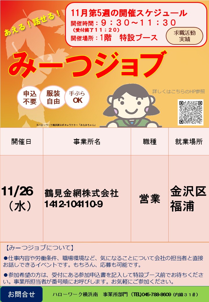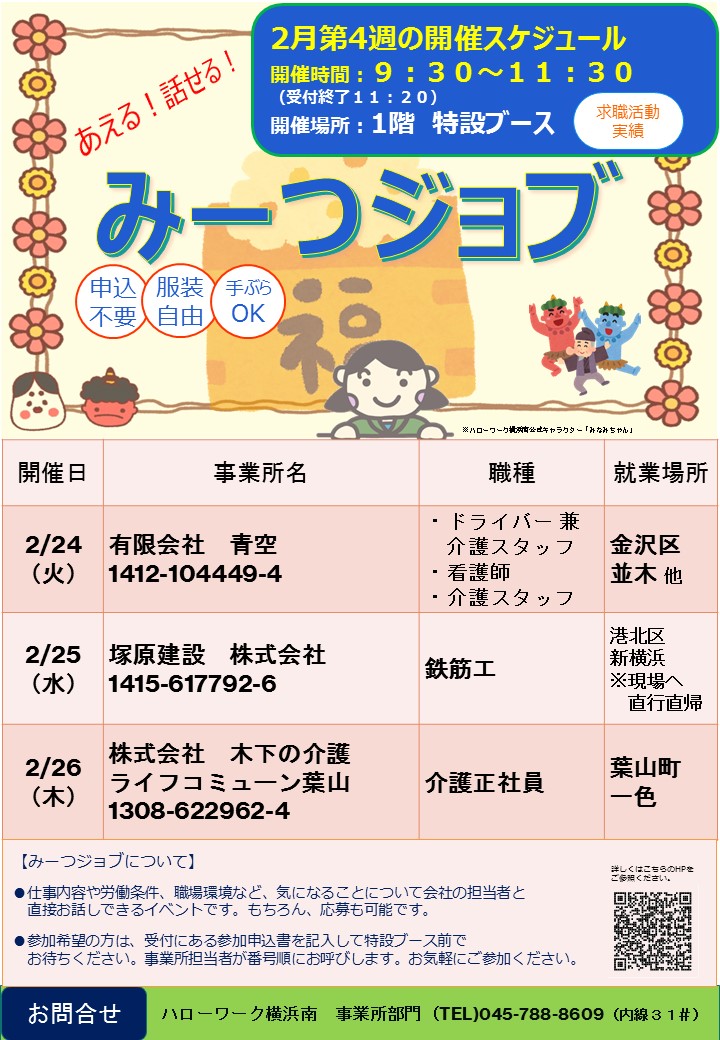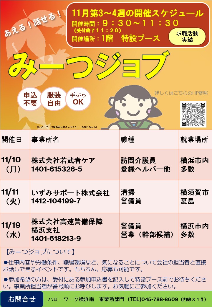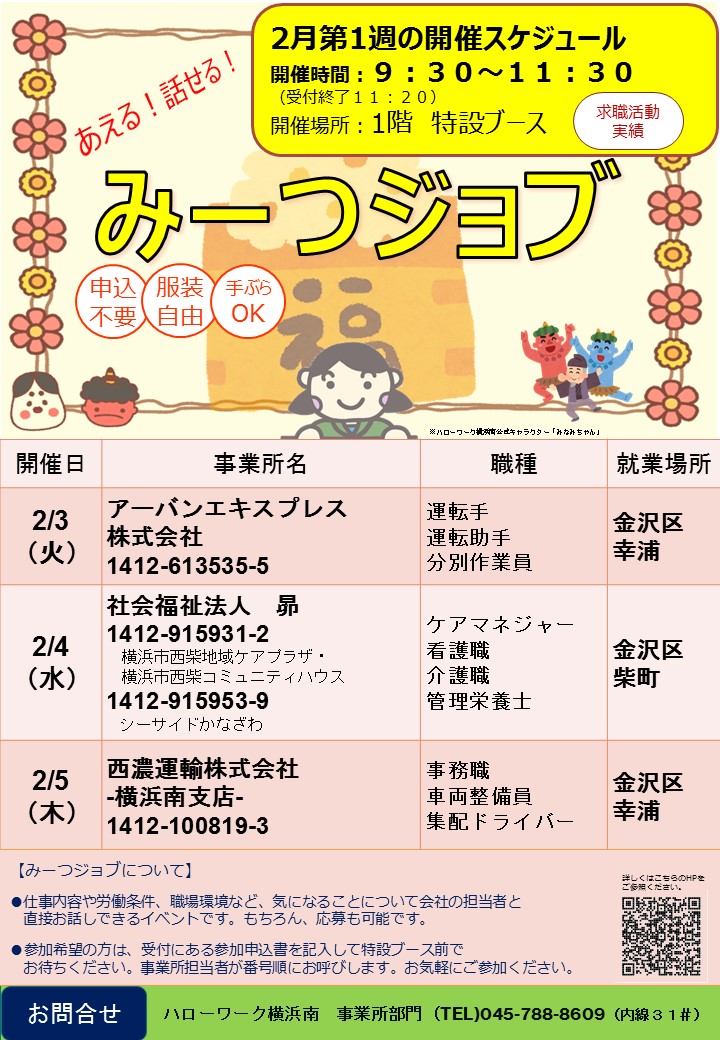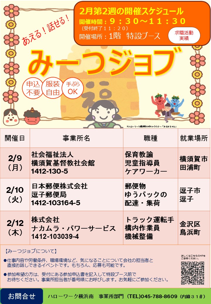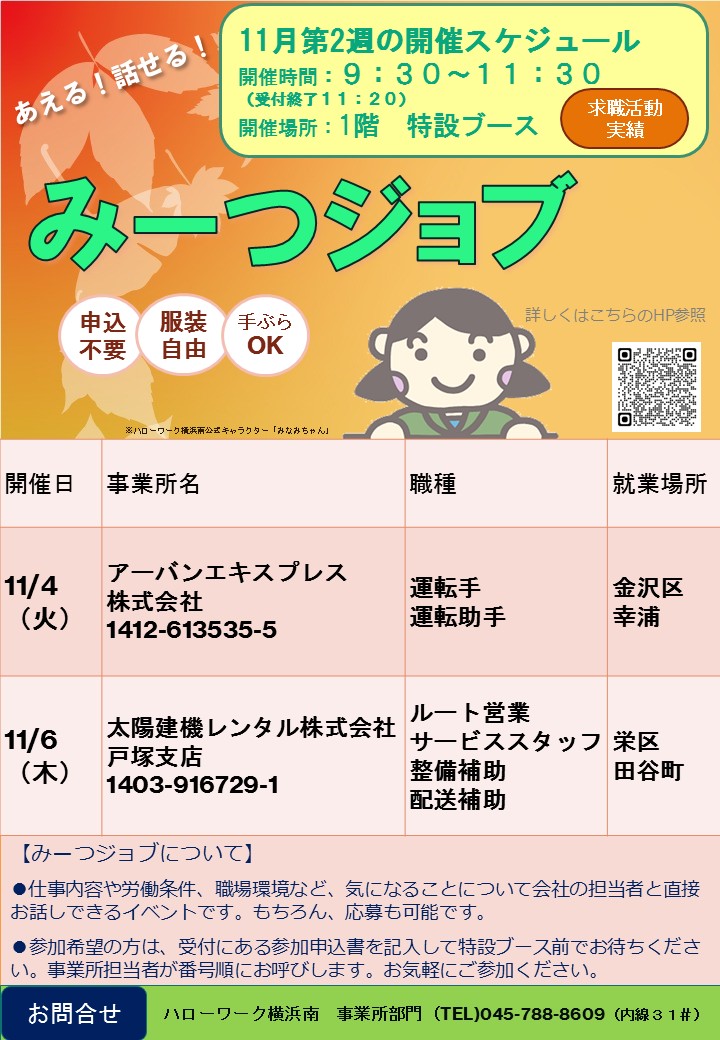 ハローワーク横浜南の1階特設ブースに会社の方が待機して、現在募集中の求人内容をはじめ、求人票以外の会社情報等を一人ひとり個別に説明・状況に応じて面接も致します。気になることを直接聞くことができる機会ですので、お気軽にご参加ください!