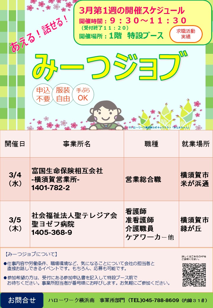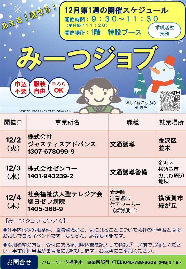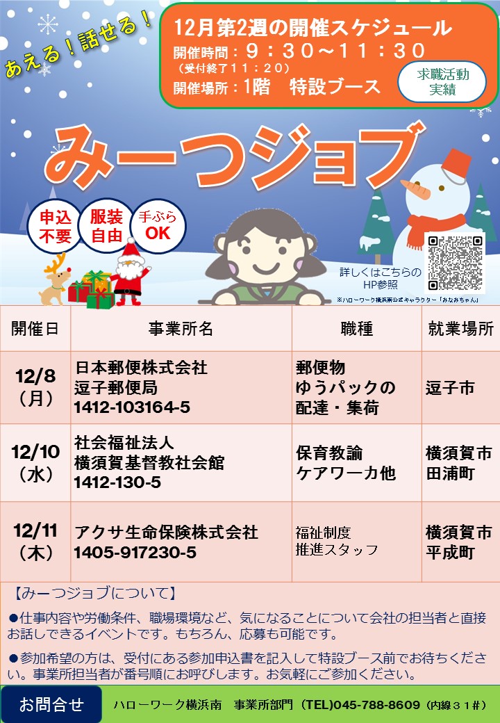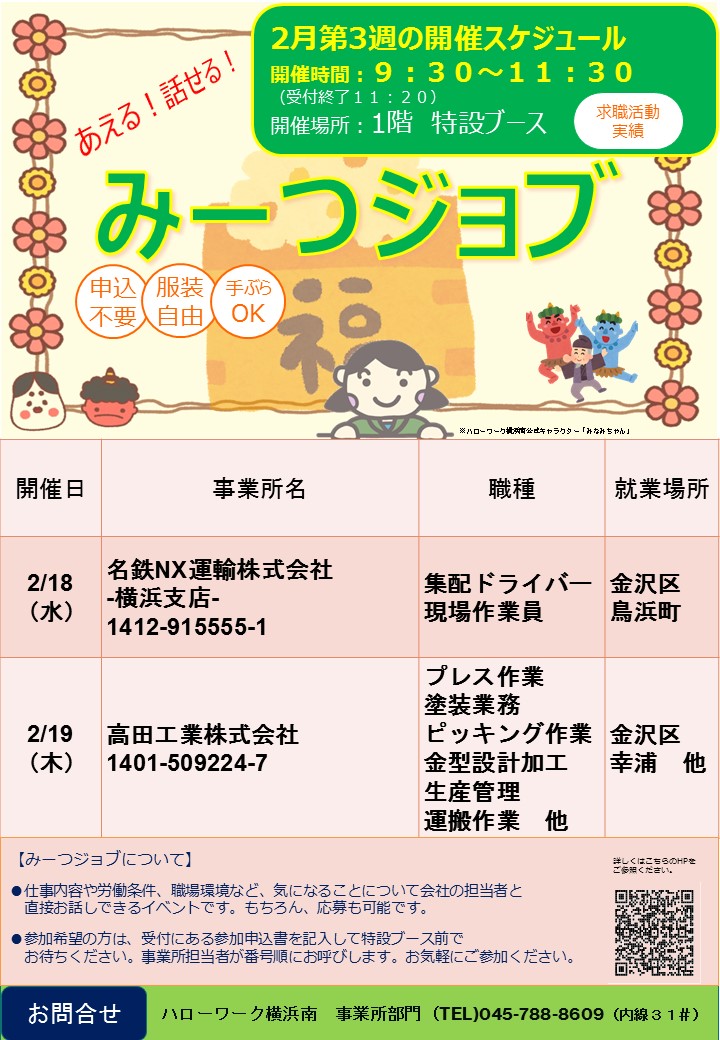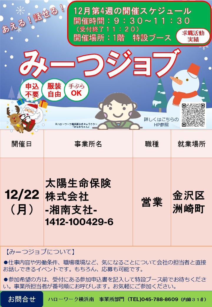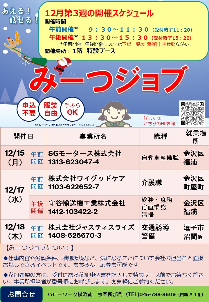 ハローワーク横浜南の1階特設ブースに会社の方が待機して、現在募集中の求人内容をはじめ、求人票以外の会社情報等を一人ひとり個別に説明・状況に応じて面接も致します。気になることを直接聞くことができる機会ですので、お気軽にご参加ください!