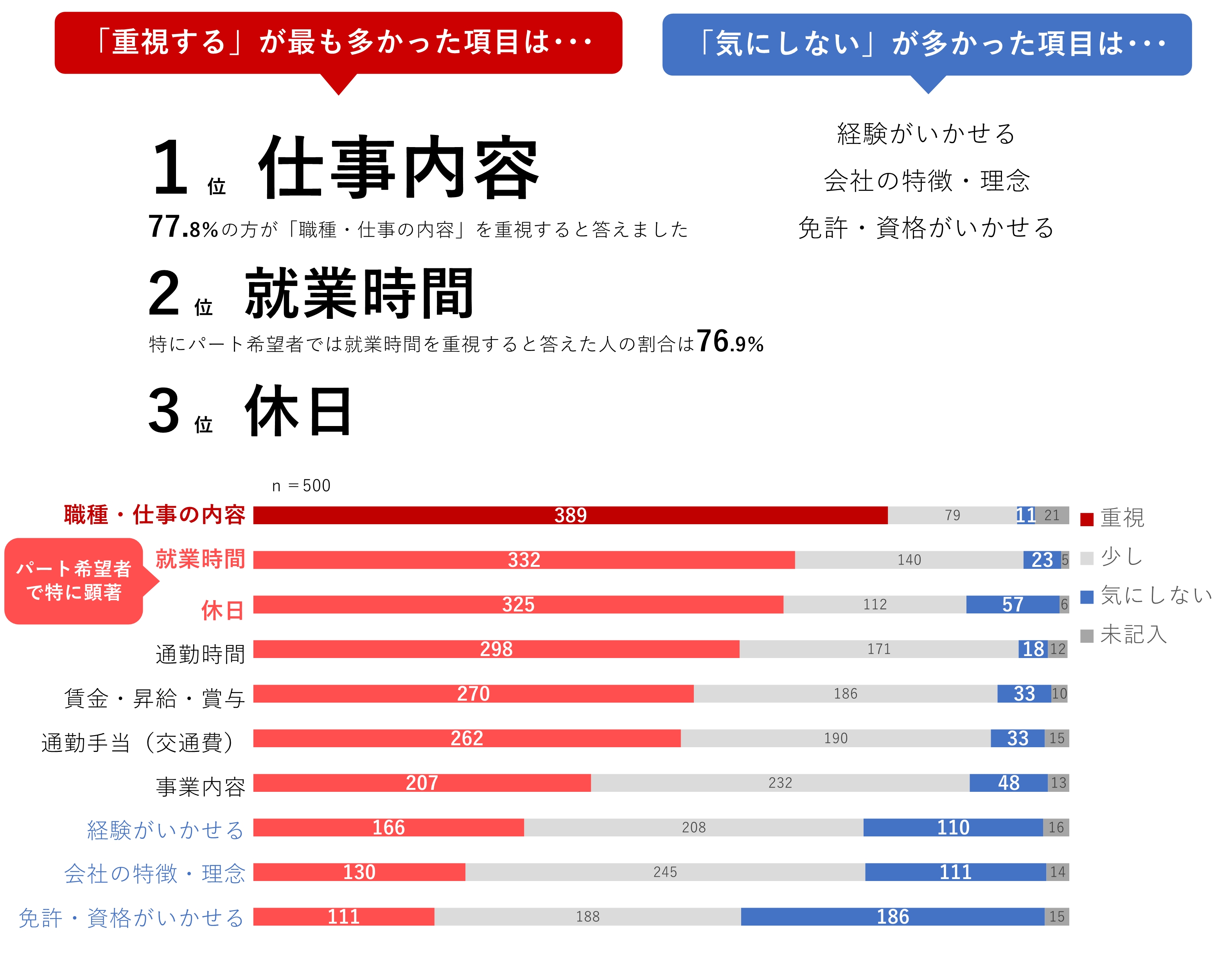 その結果からは、求職者が仕事探しにおいて何を重視し、どのような情報を元に応募の判断をしているのかが見えてきます。