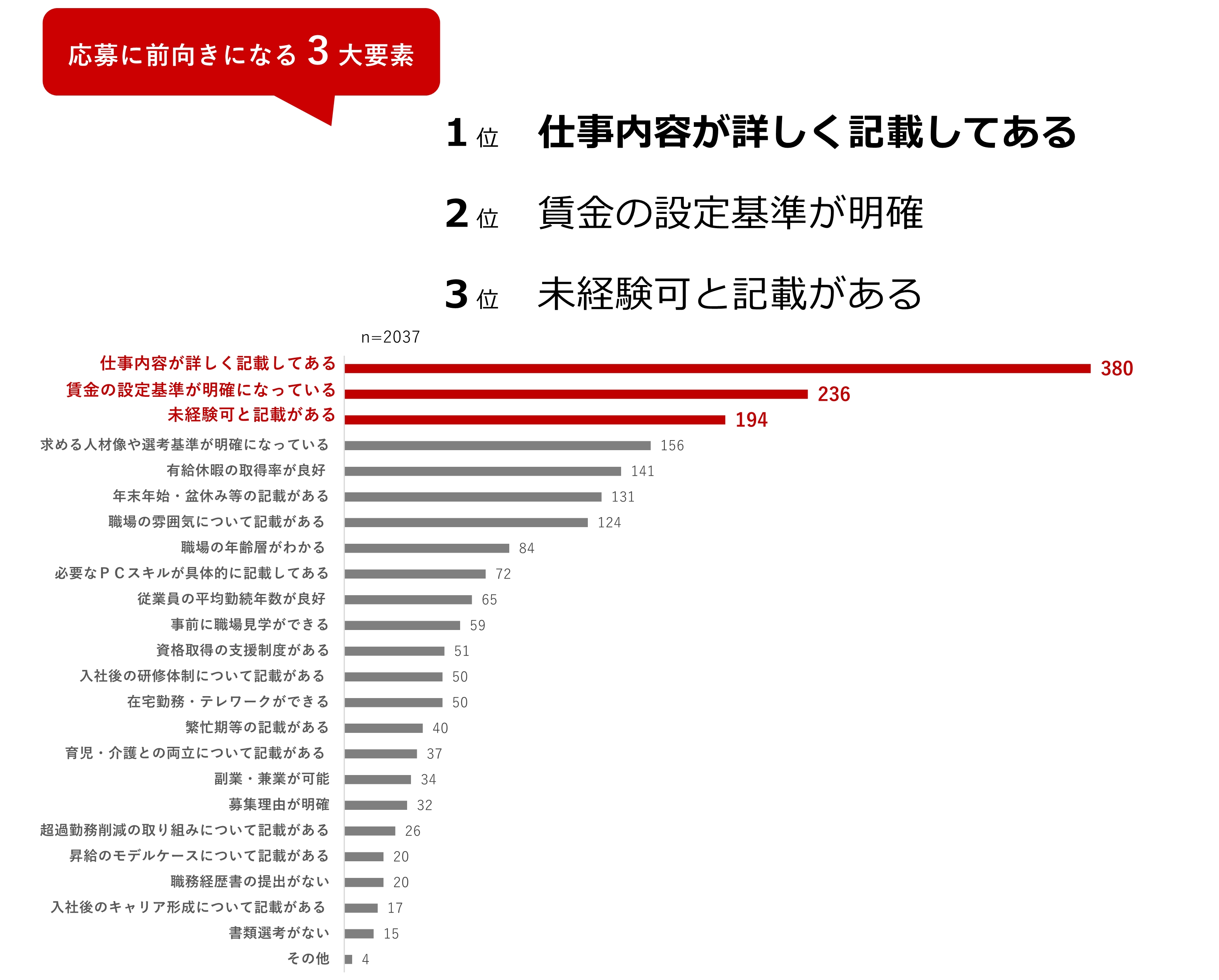 応募にあたっては「仕事内容」を重視していること、応募に前向きになる要素として「仕事内容が詳しく記載してある」が突出して多いことがわかりました。