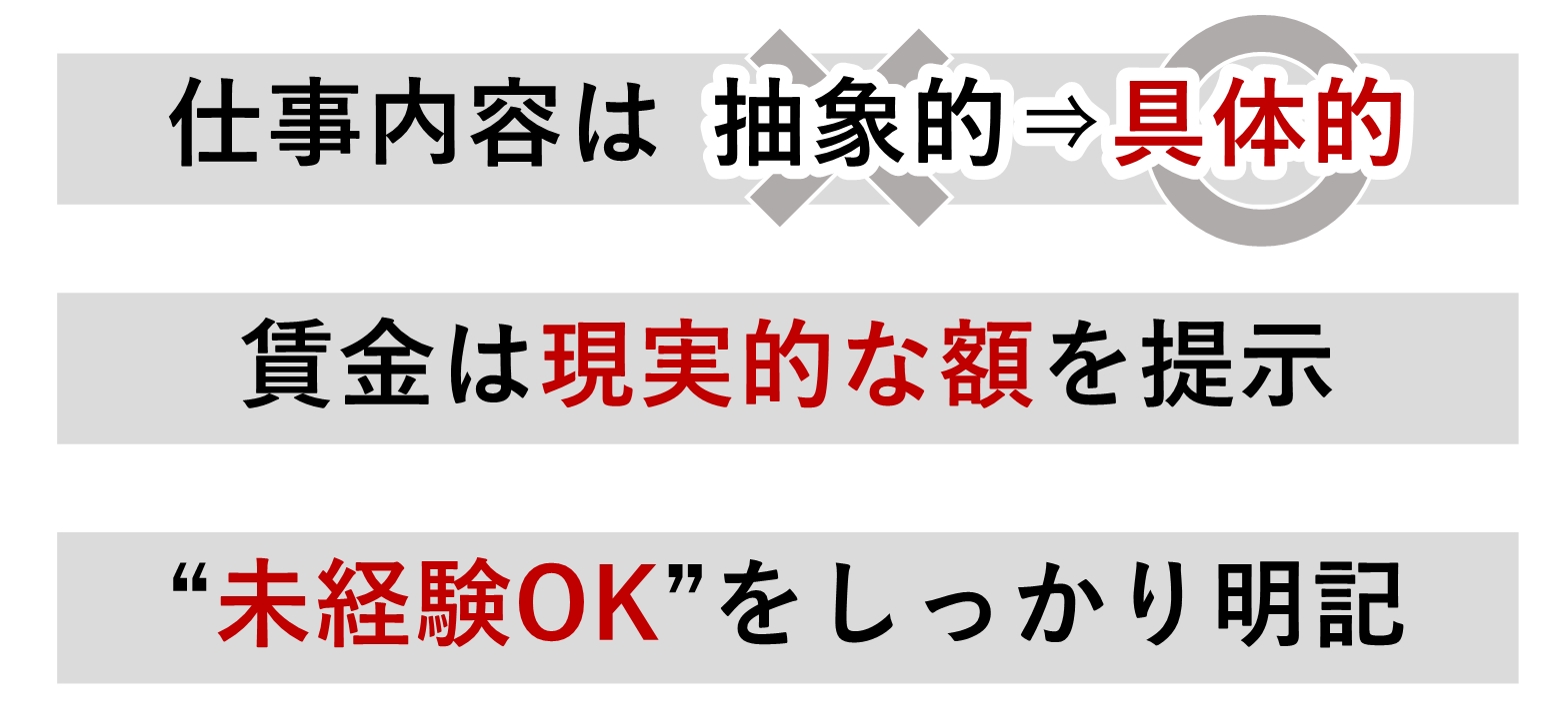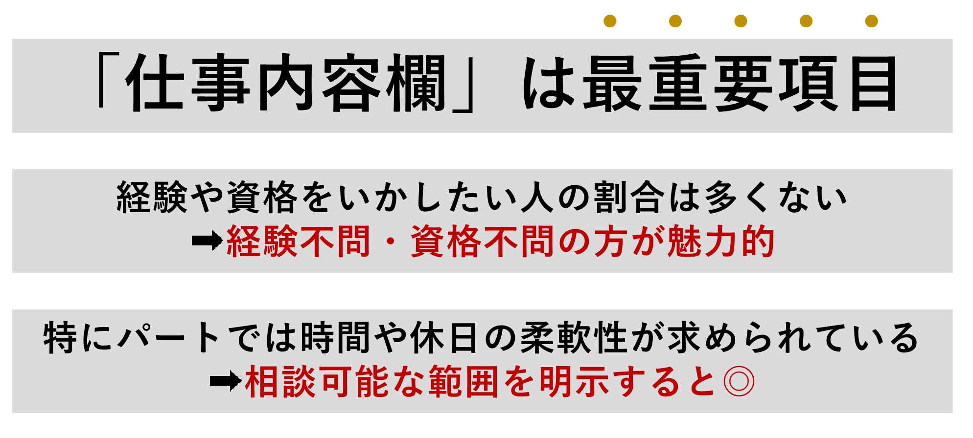 募集の際は求人票の「仕事内容欄」を具体的にわかりやすく、魅力的に記載することが鍵になります。