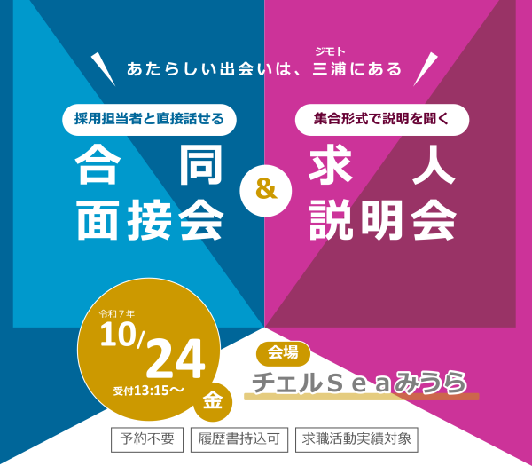 ご案内チラシはこちら⇒合同面接会・企業説明会inチェルSeaみうらご案内チラシ【PDF】
