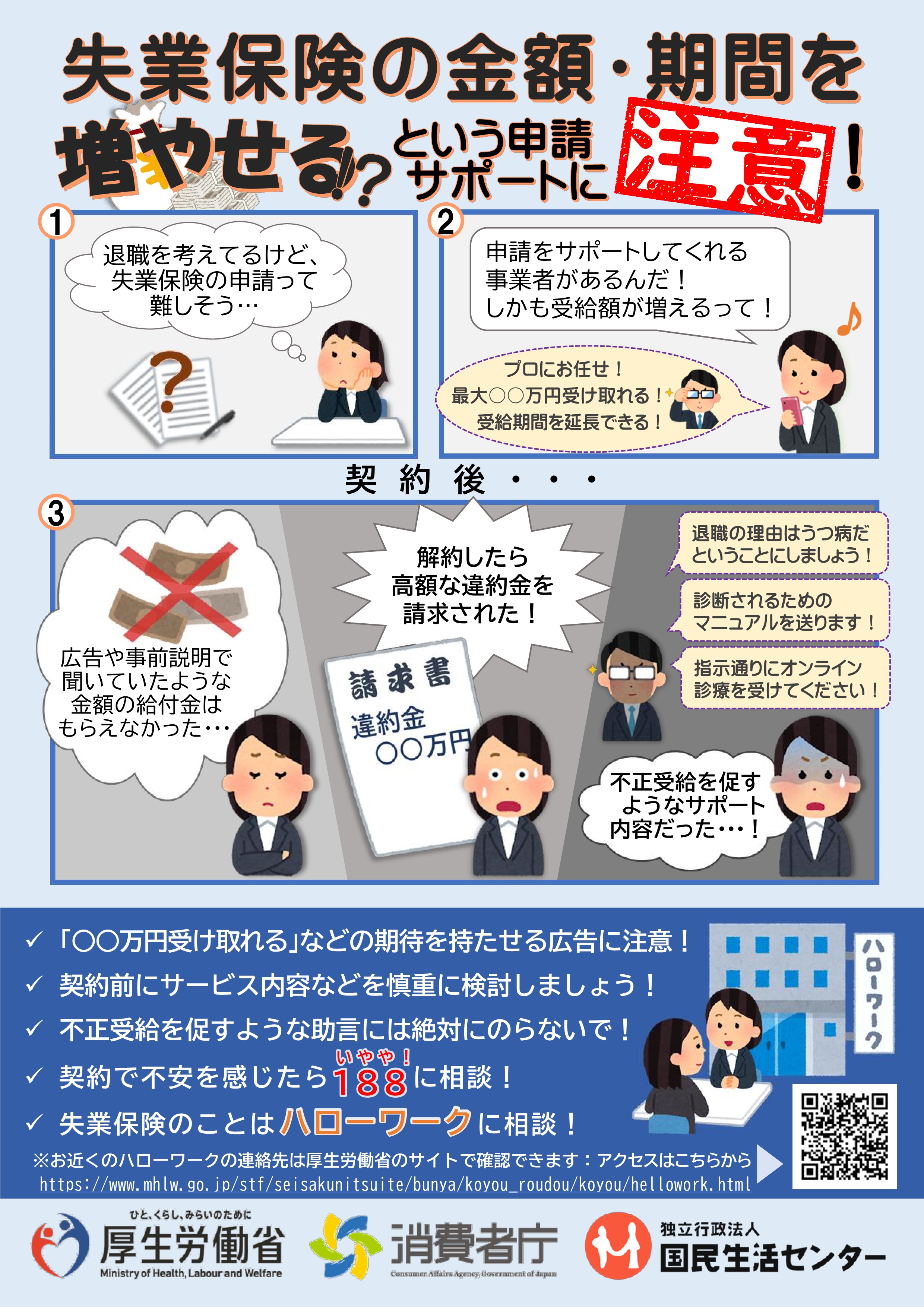 最近、全国の消費生活センター等には、「失業保険の受給額や受給期間が増える」とうたう申請サポート事業者に関する相談が寄せられ、注意喚起がなされています。