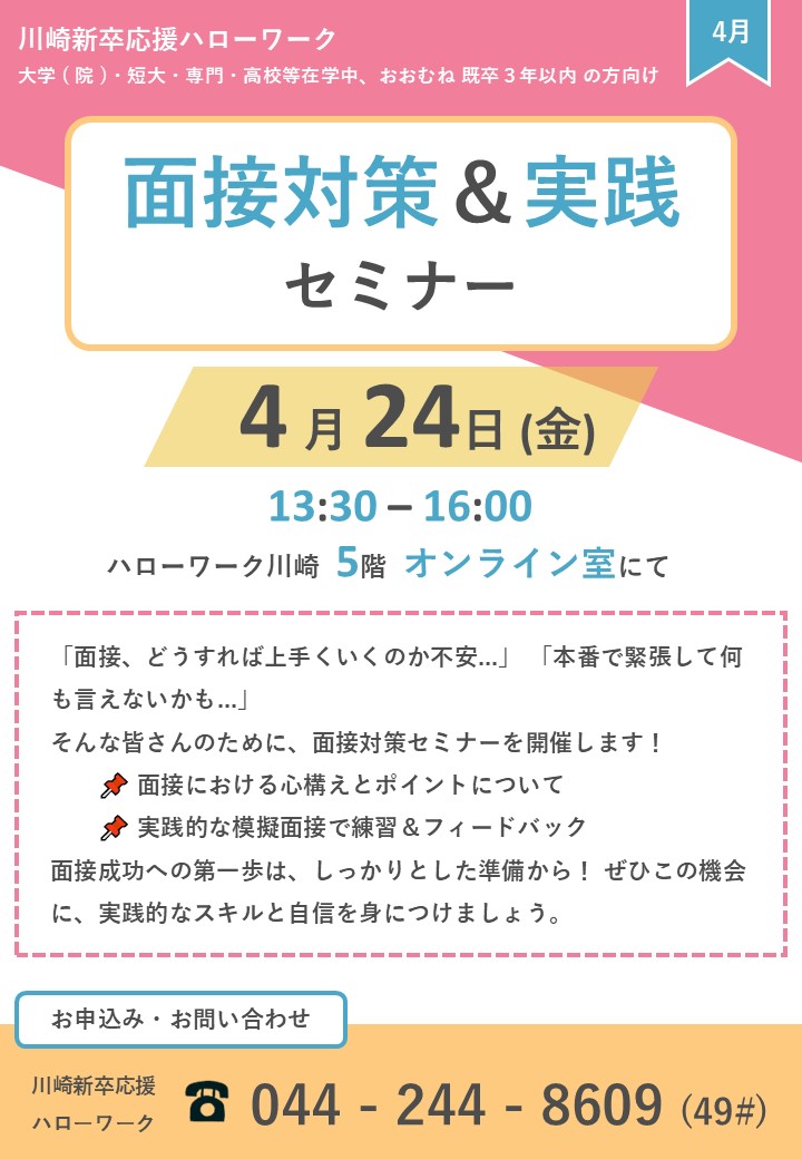 ・4月のセミナーは4月24日(金)「面接対策&実践セミナー」です。