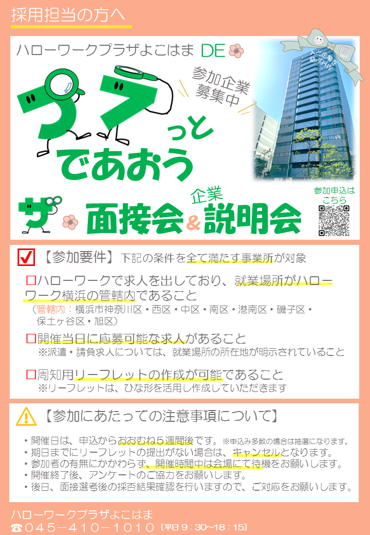 参加については、下記【参加申込】から必要事項を入力し送信してください。 後日、詳細についてハローワークプラザよこはまから、メールまたは電話にてご連絡します。 ※面接会開催日および周知用リーフレットのひな形については、参加申込後にご案内します。
