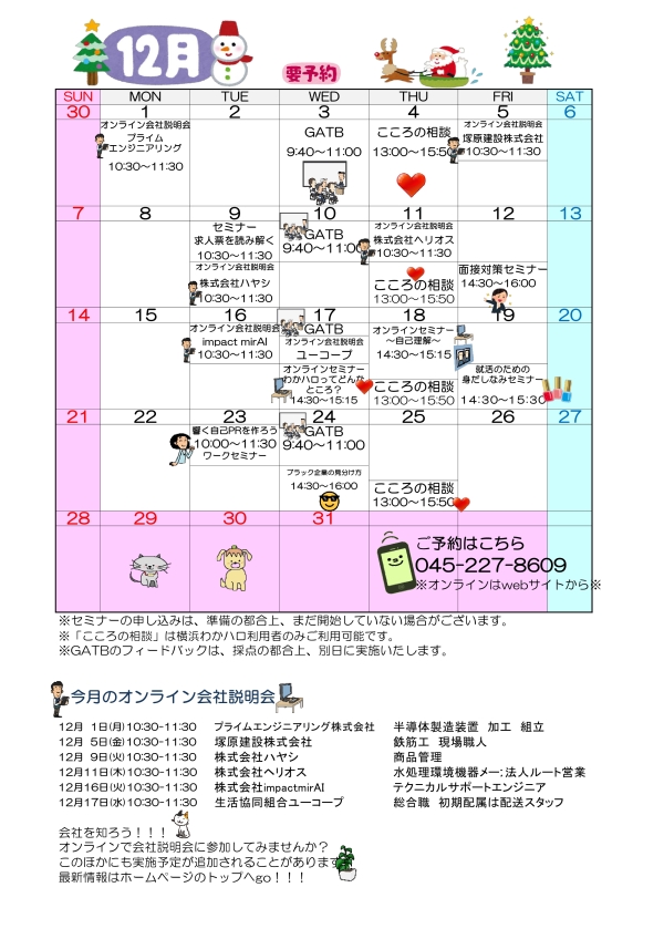 - 12月23日 10:00~11:30 来所型グループワークセミナー