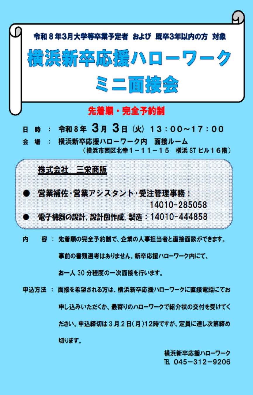 | 申込方法 | 完全予約制・先着順のため、応募希望の方は横浜新卒応援ハローワークまで 電話:045-312-9206で面接の予約をお願いします。または、 最寄りのハローワークの窓口を通して予約の上、紹介状の交付を受けてください。 |