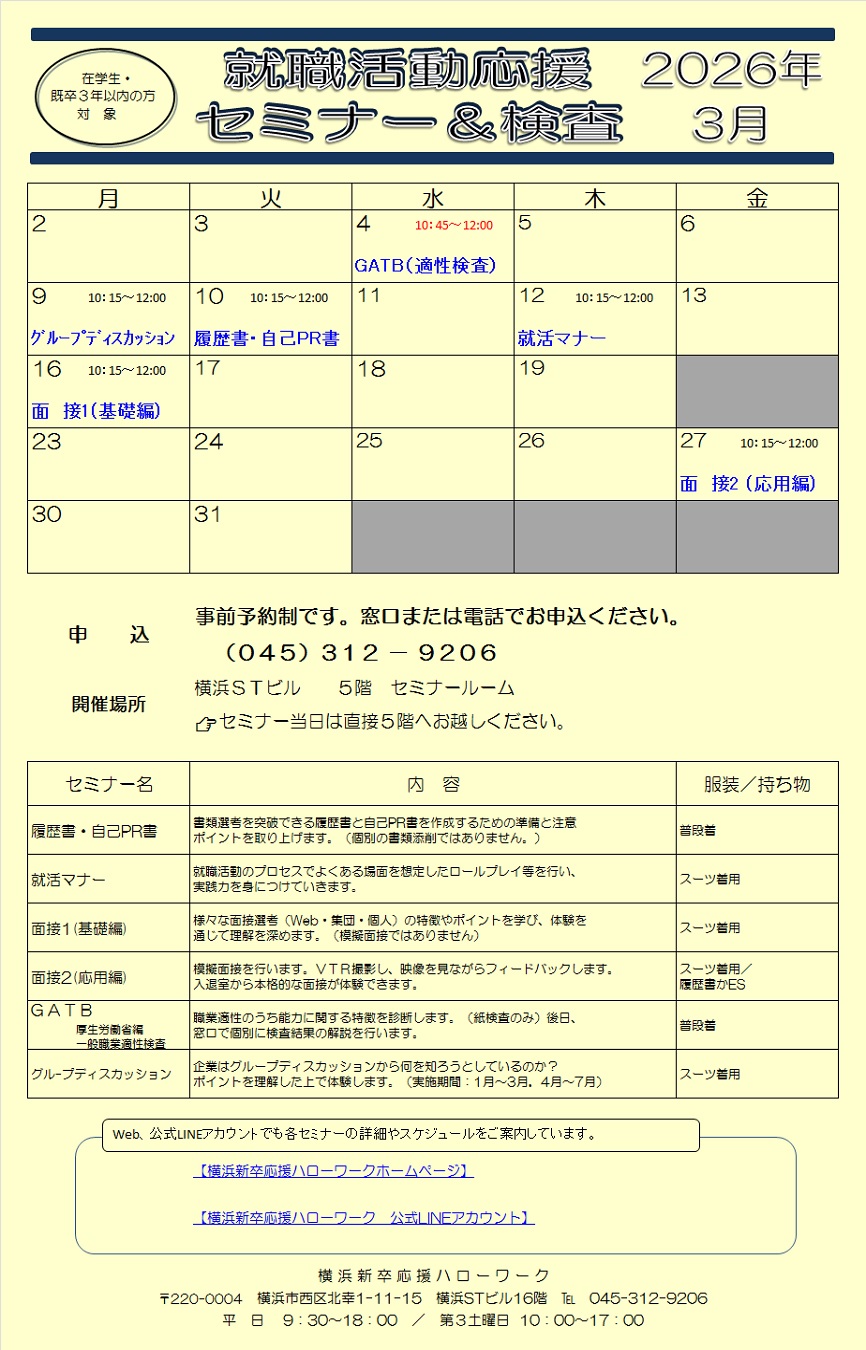 | 予約方法 | 申し込み受付け開始は開催月の前月1日(閉庁日の場合は最初の開庁日)からとなります。 横浜新卒応援ハローワーク窓口、または電話:045-312-9206でお申し込みください。 定員になり次第、受付を締め切ります。 セミナー開催人数に満たない場合は、開催を中止いたします。中止時点で対象セミナーに 参加申し込み済の方には、当所からご連絡いたします。 |