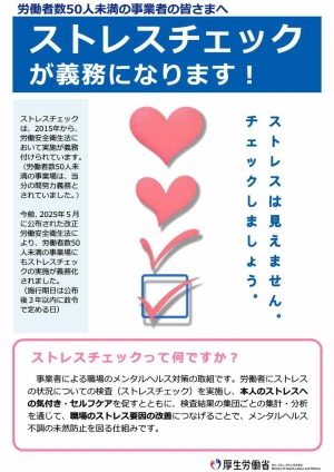 ストレスチェックは、2015年から労働安全衛生法において実施が義務付けられています。労働者数50人未満の事業場は、当分の間努力義務とされていましたが、今般、2025年5月に公布された改正労働安全衛生法により、労働者数50人未満の事業場にもストレスチェックの実施が義務化されました。(施行期日は公布後3年以内に政令で定める日)