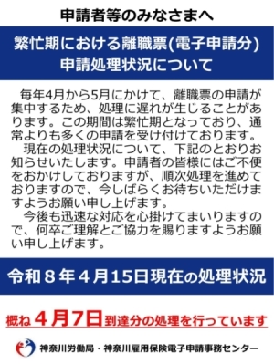 | 2026年04月15日 | 離職票(電子申請分)の申請処理状況について |