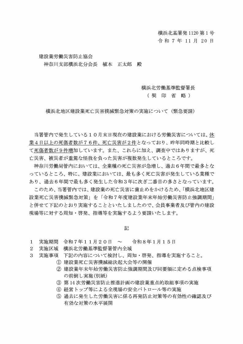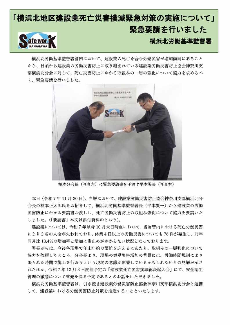令和7年11月20日 建設業の労働災害増加を受け、建災防神奈川支部横浜北分会に対して、緊急要請を行いました
