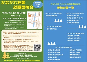 県内の林業事業体(森林組合・林業企業)が参加する面接会です。 18の事業体が参加予定です。 林業にご関心のある方は、この機会に是非、ご参加ください。 令和7年11月28日(金) 13時ー16時 会場:足柄上合同庁舎 本館5階 (足柄上郡開成町吉田島 2489-2) クリックするとPDFデータをご覧頂けます