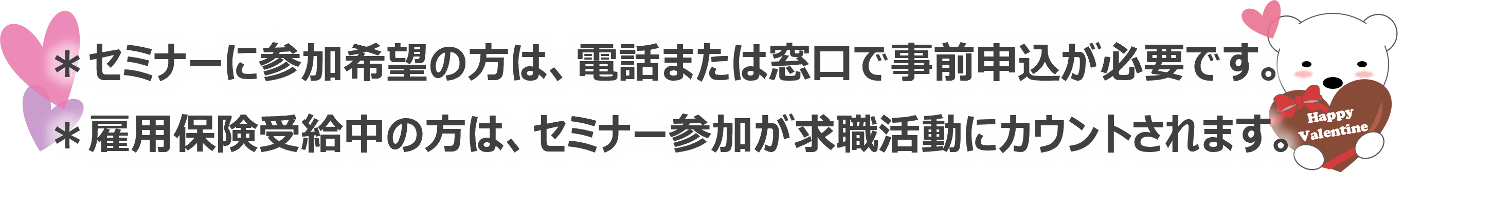 求職者マイページを始め、ハローワークのオンラインサービスを利用したい方はぜひ受講してください。セミナー当日はスマートフォンをお持ちください。 |