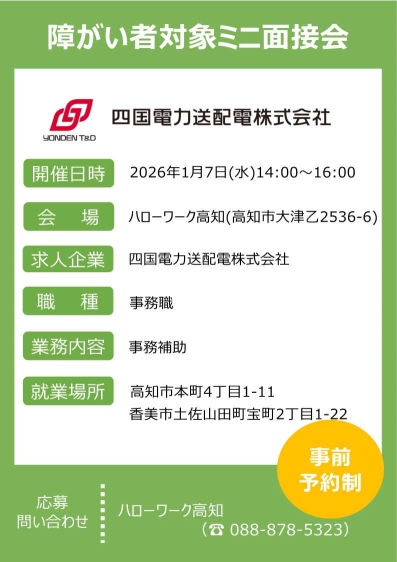 ハローワーク高知にて、障害者の方を対象としたミニ面接会を開催します。 定員に達し次第、受付を終了します。 ご参加を希望される場合、お早めに問い合わせ先までご連絡をお願いします。 【参加企業】 四国電力送配電(株) 【日時】 令和8年1月7日(金) 14:00~16:00 【会場】 ハローワーク高知 1階多目的室(高知市大津乙2536-6) ※求人は窓口のみでの公開になります。詳細希望の場合は、一度ご相談ください。 ※詳細はリーフレットからご確認ください。