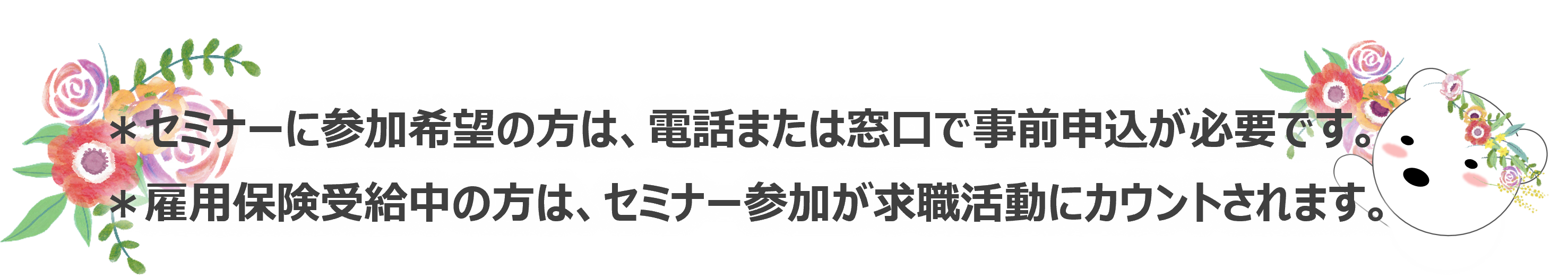 求職者マイページを始め、ハローワークのオンラインサービスを利用したい方はぜひ受講してください。セミナー当日はスマートフォンをお持ちください。 |