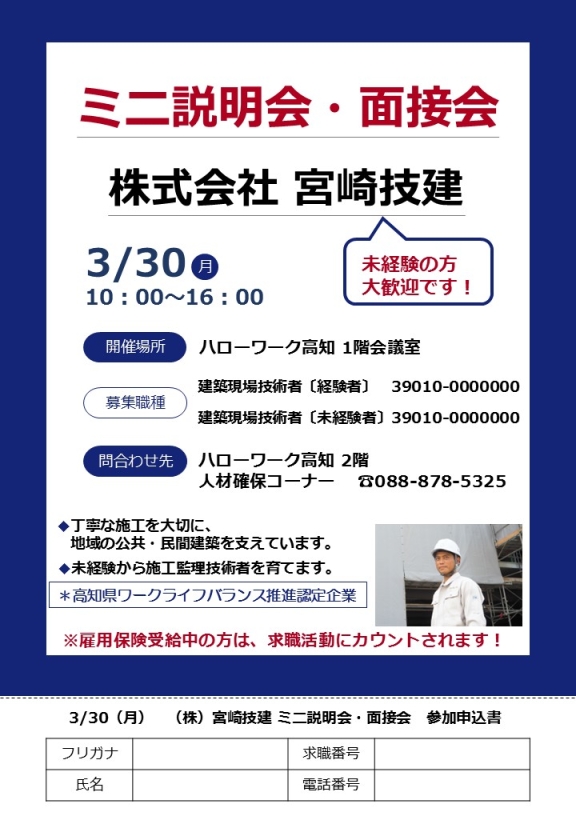 ハローワーク高知では、令和8年3月30日(月)に、株式会社 宮崎技建のミニ説明会・面接会を開催しました。