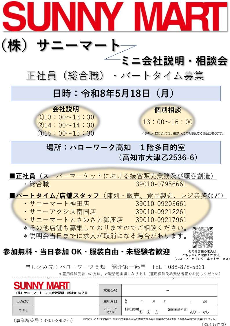 ハローワーク高知にて、株式会社サニーマートの会社説明・相談会を開催します。