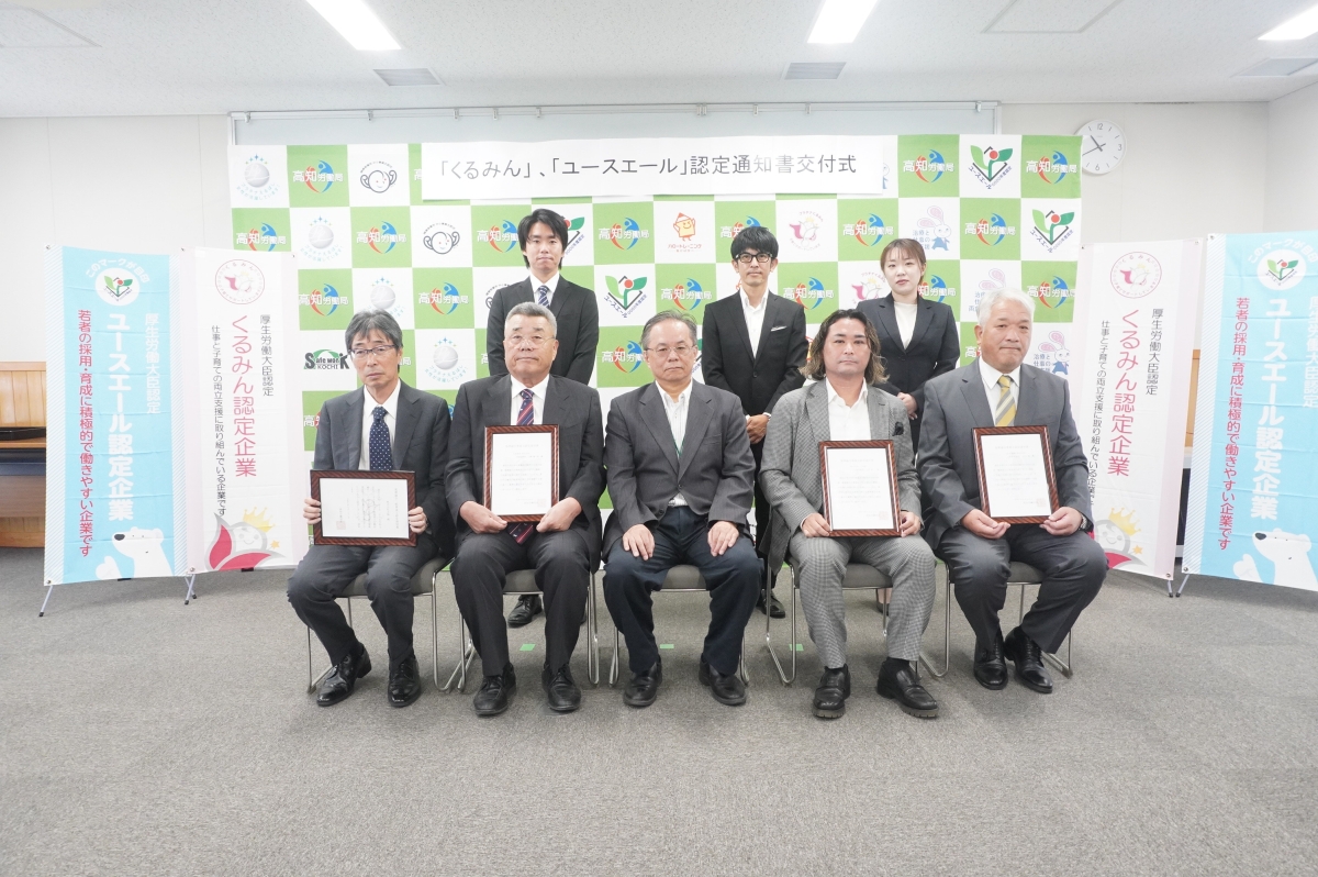 高知労働局(局長 菊池 宏二)は、次世代育成支援対策推進法及び若者雇用促進法に基づき「子育てサポート」、「若者の採用・育成」について雇用管理の改善に取り組む優良な企業として認定した4社に認定通知書を交付しました。