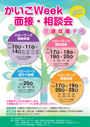 高知労働局(局長:菊池宏二)では、介護関係の求人・求職のマッチングを促進するため、令和7年度「かいごWeek面接・相談会(介護就職デイ)」(介護関係就職面接会)を、県内4会場で開催することとしました。