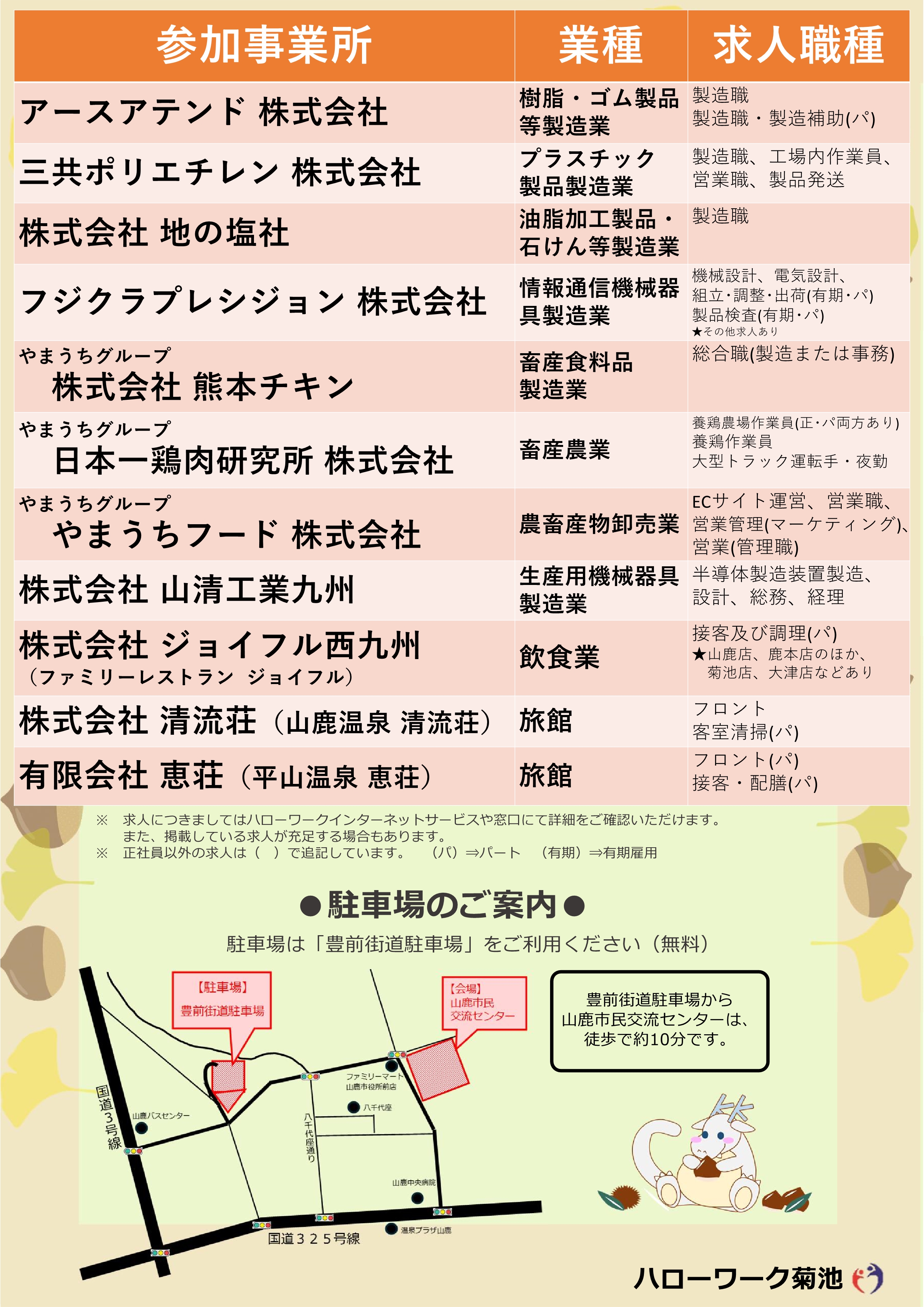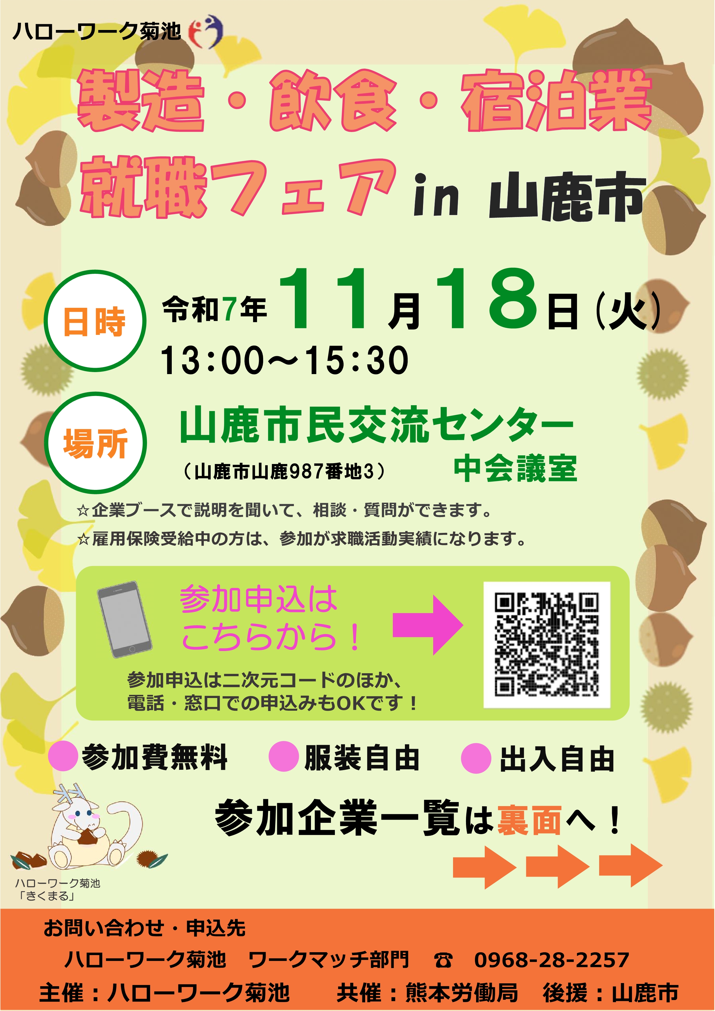 令和7年11月18日(火)に製造・飲食・宿泊業の企業が合計11社集まる就職フェアを山鹿市にて開催します!