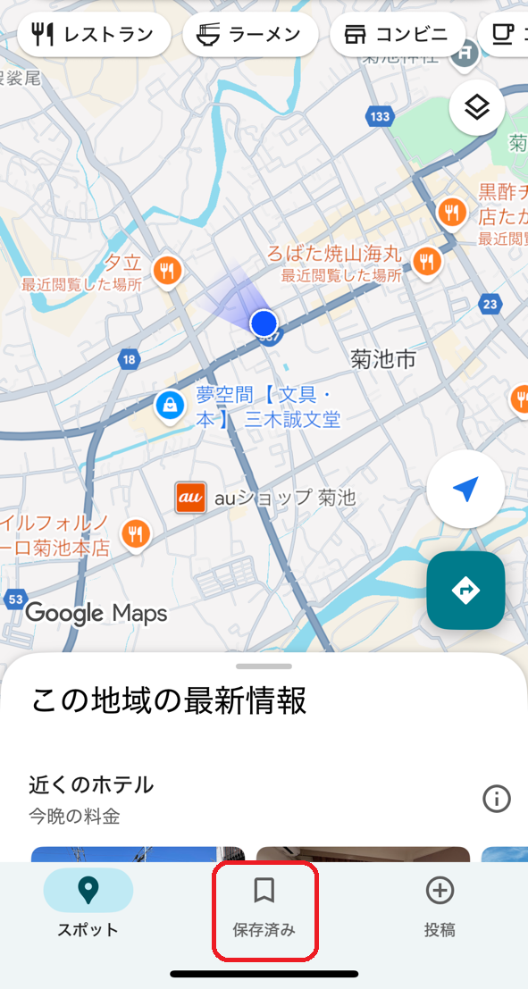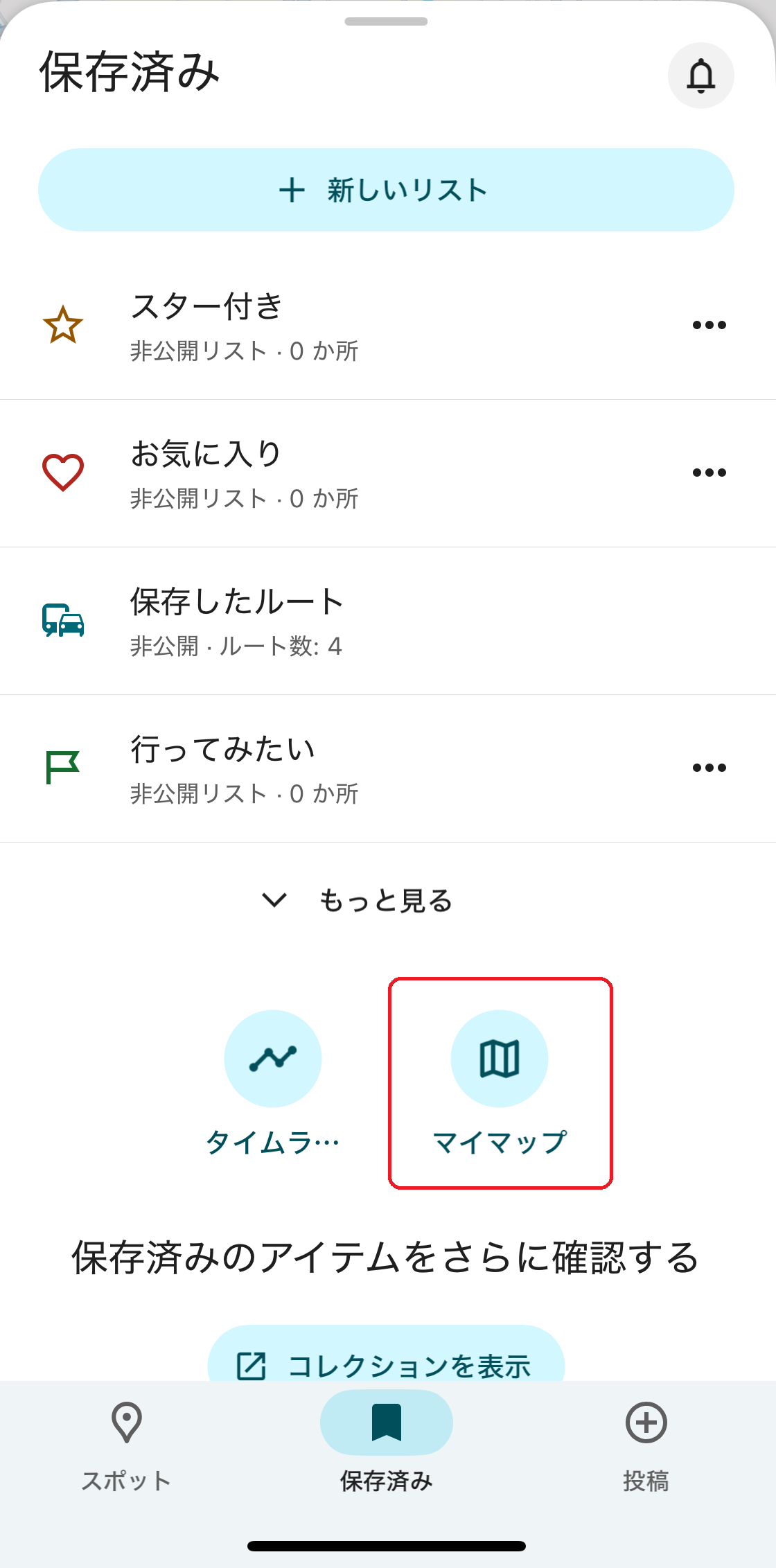 ①画面下の「保存済み」を押す ②「マイマップ」を押す