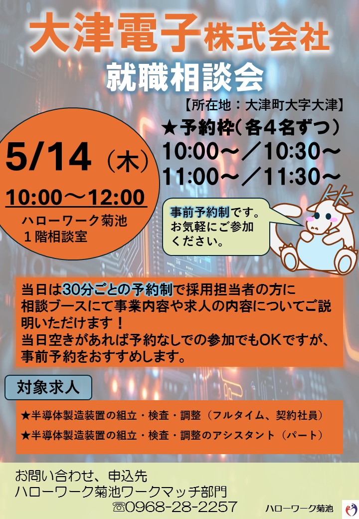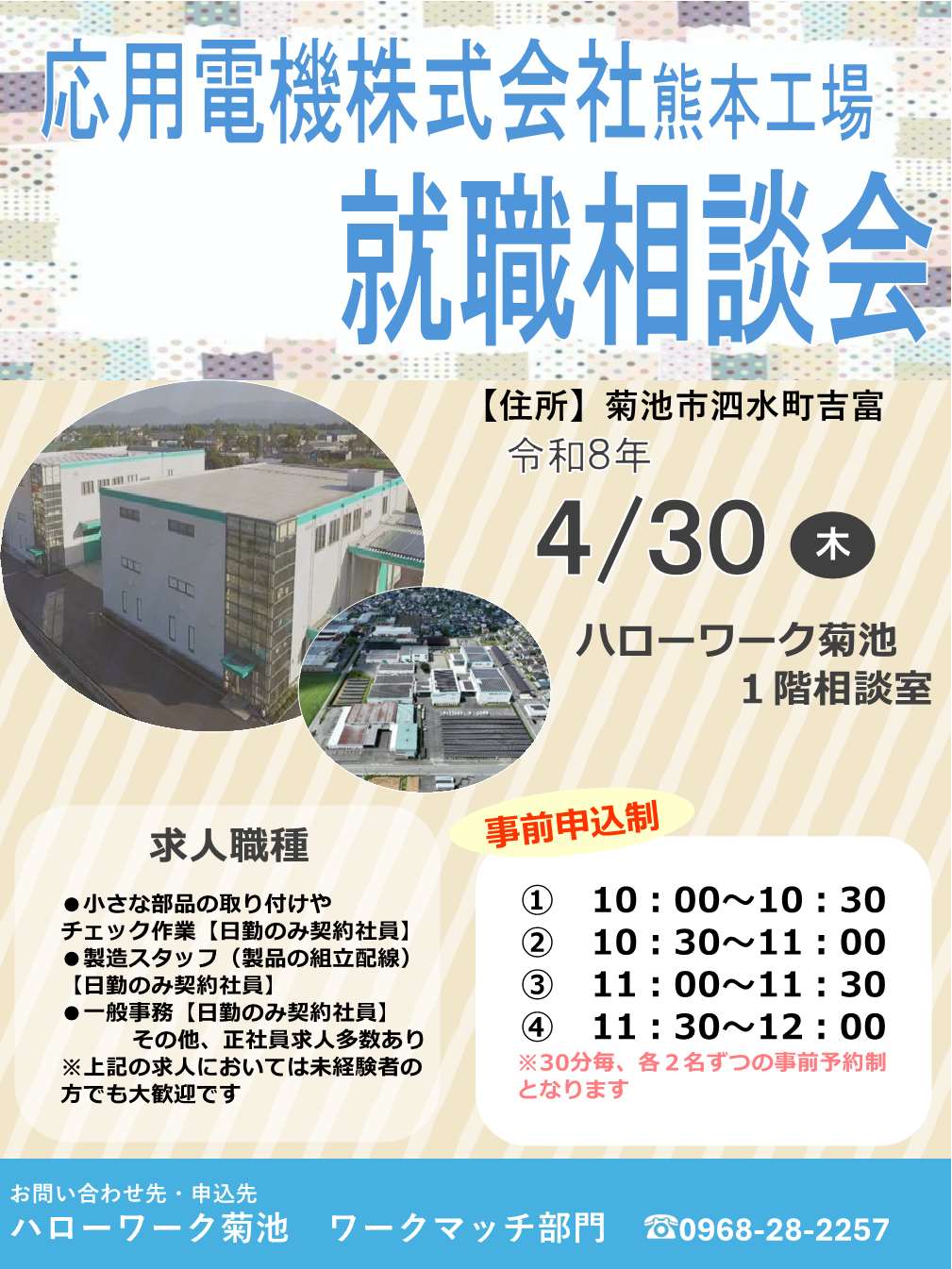 ●ハローワーク菊池で開催 ●服装は自由です ●当日参加も可能ですが、予約の方優先となります ※予約はハローワーク菊池の窓口か電話でも可能です(☎0968-24-8625) ●雇用保険受給者の方は、活動実績の1回になります ●当日面接も可能、希望の方は応募書類を持参してください ★今後のスケジュール★ (クリックで拡大・詳細ページが開きます) 4月30日(木)応用電機株式会社 就職相談会