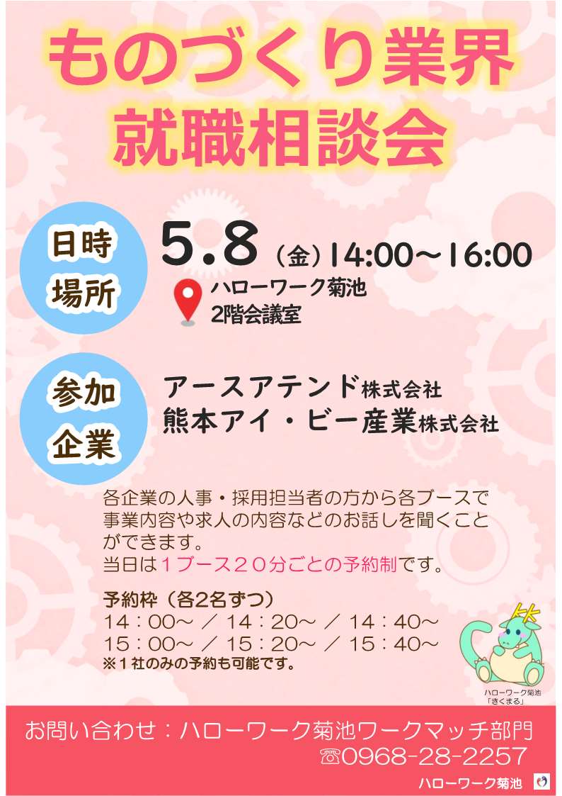 5月 就職相談会 5月8日(金)ものづくり業界 就職相談会 ・アースアテンド株式会社 ・熊本アイ・ビー産業株式会社