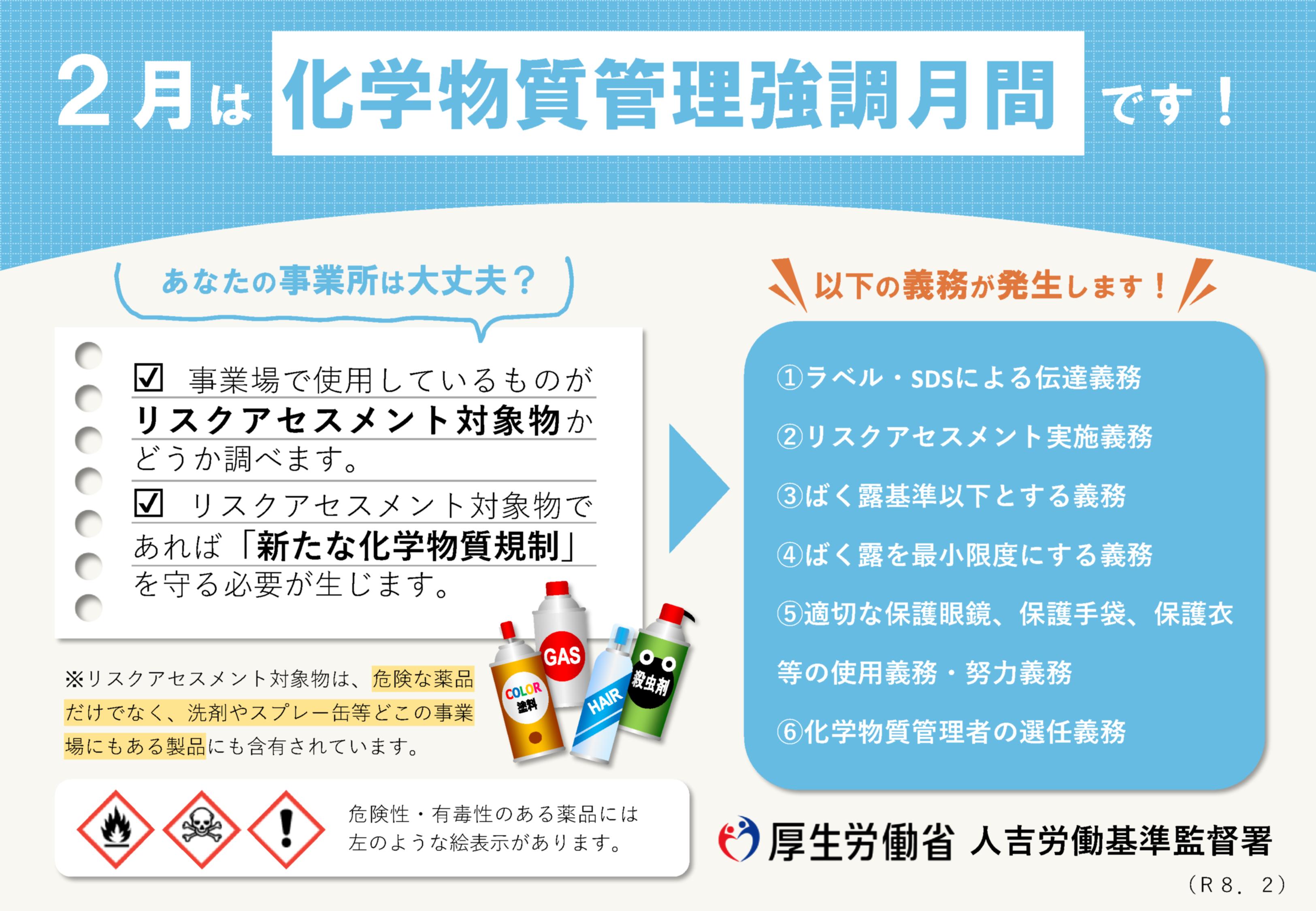 厚生労働省では、産業界における自律的な化学物質管理活動を推進するとともに、広く一般における危険・有害な化学物質管理の重要性に関する意識の高揚を図るため、2月を化学物質管理強調月間として化学物質対策の取組促進を図っています。