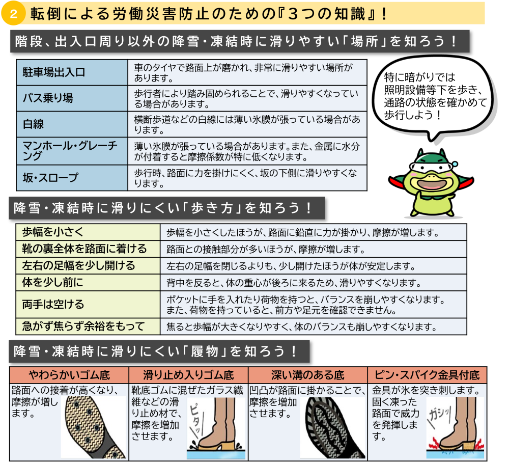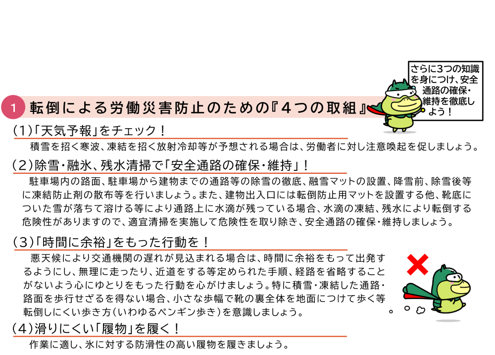 各事業場、そして労働者一人一人が、通常の転倒災害対策に加え、以下により、積雪や凍結するような通路・路面を原因とした転倒による労働災害防止のための取組の徹底をお願いします!!