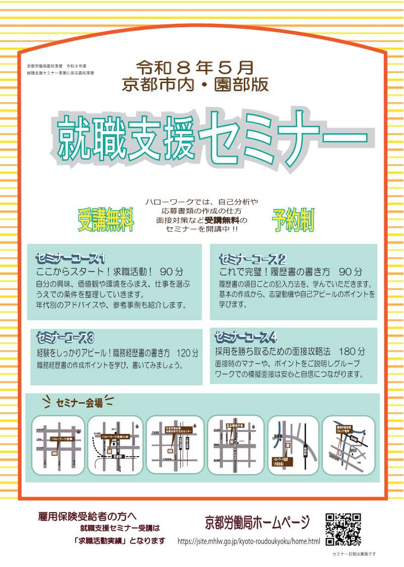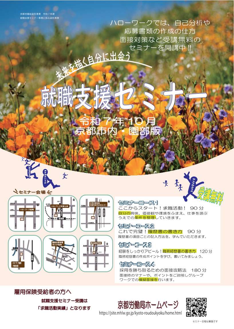 京都労働局(ハローワーク)では主に雇用保険受給者を対象に、再就職活動に役立つ就職支援セミナーを開講しています。