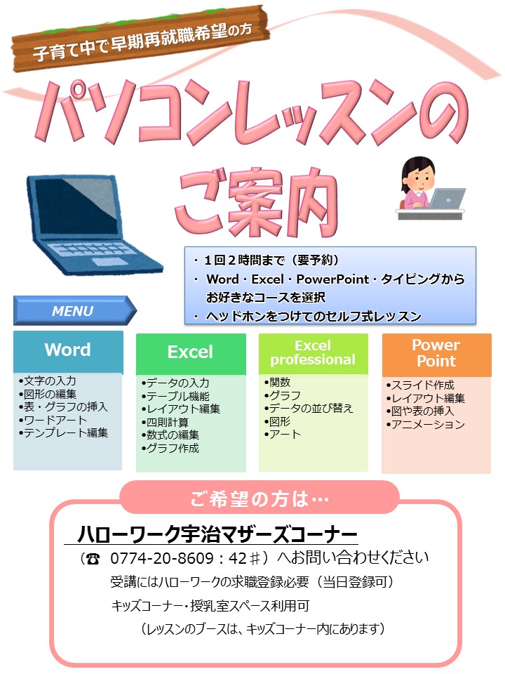 ハローワーク宇治マザーズコーナーでは、子育て中で早期再就職希望の方に、WordやExcelなどのオフィスソフトが学べるセルフレッスンのお申し込みを受け付けています。事務職またはそれ以外の職種をご希望の方、どなたでも基本的なパソコン操作が学べますので、是非ご検討ください。