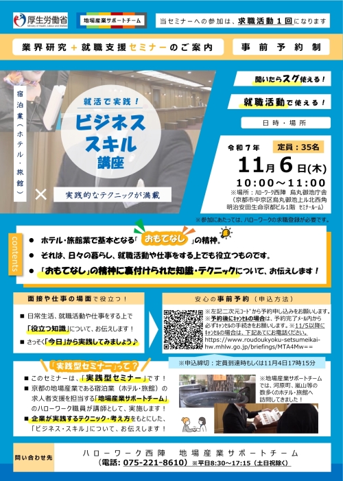 京都のホテル・旅館業で培われた“おもてなし”の精神をベースに、日常生活や職場で活かせるビジネスマナーを、ハローワーク職員がわかりやすく解説します。